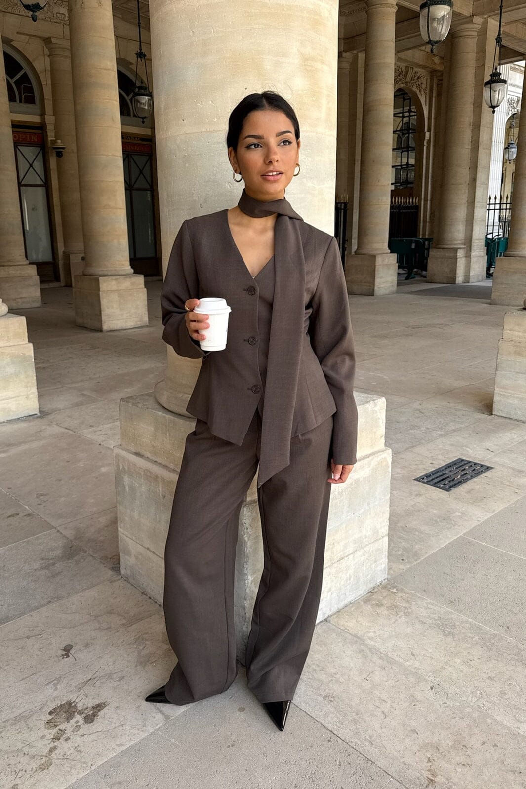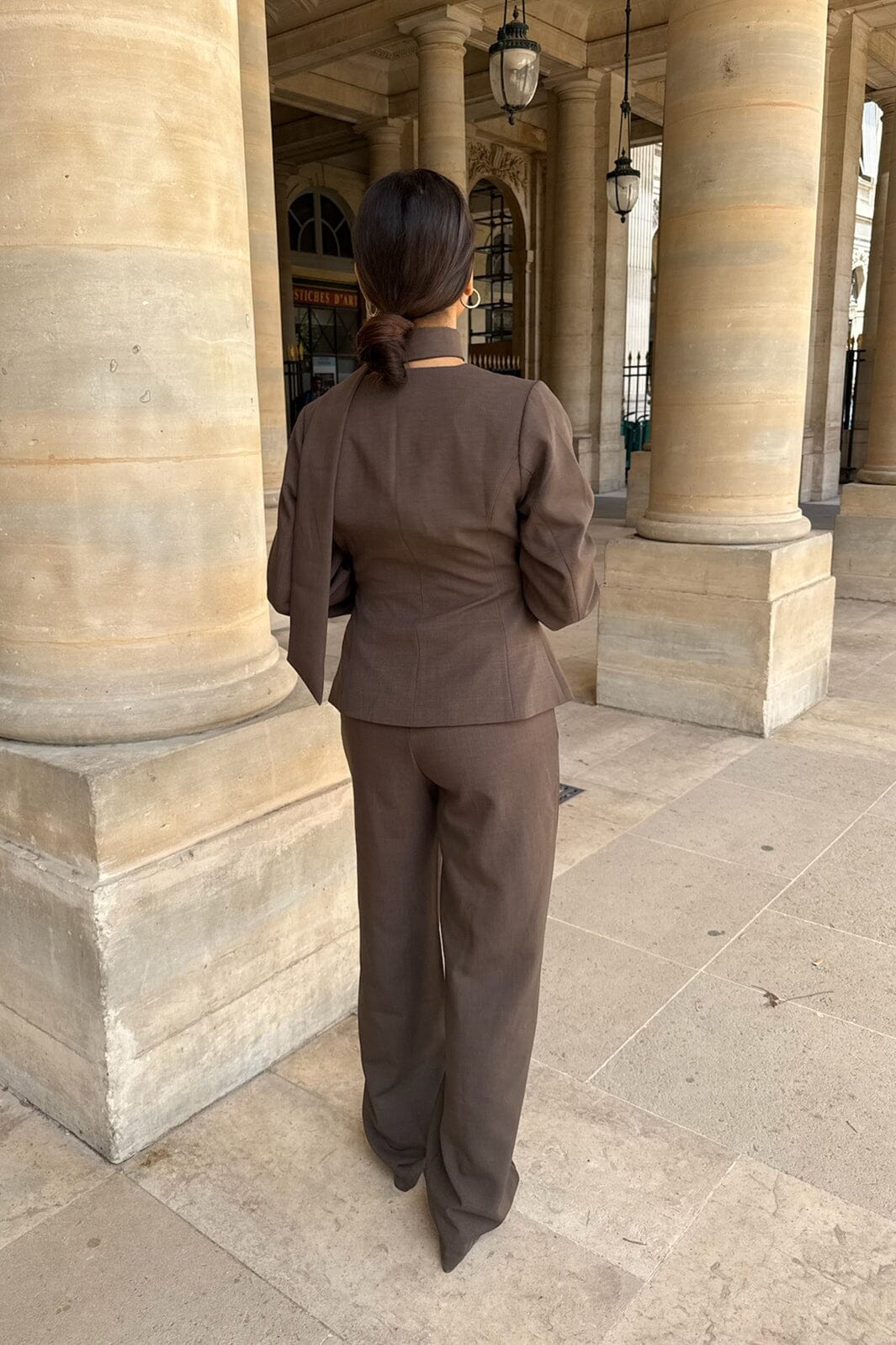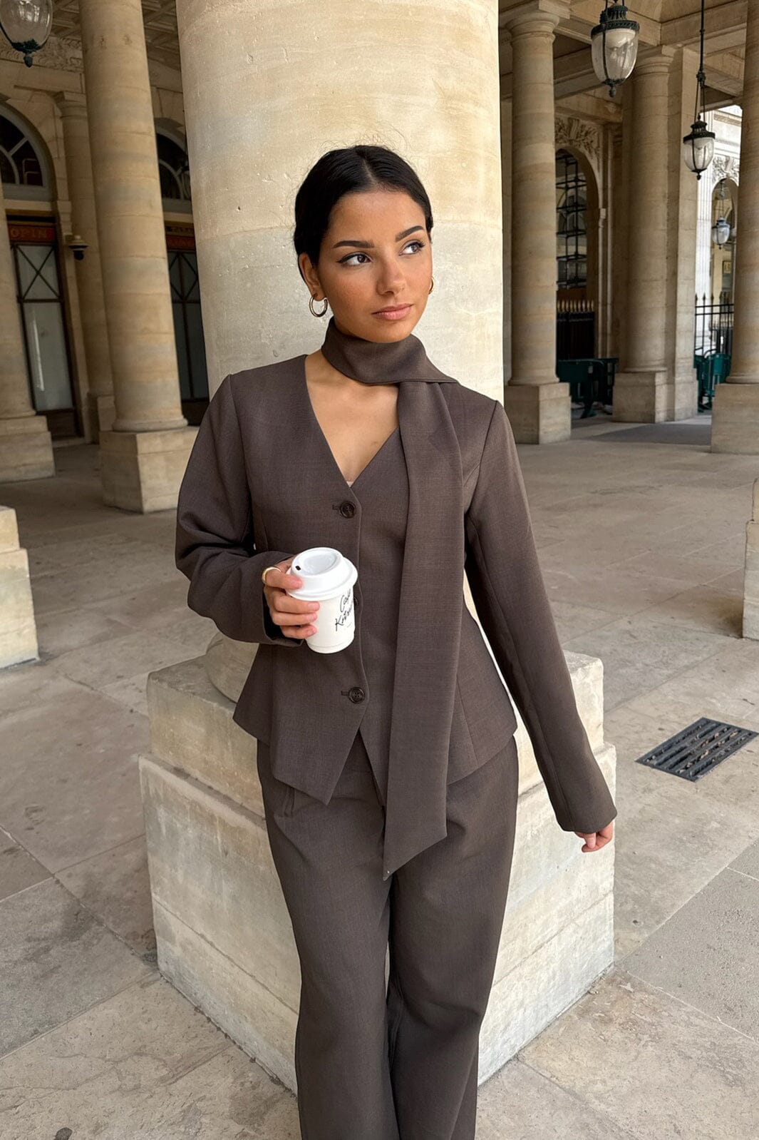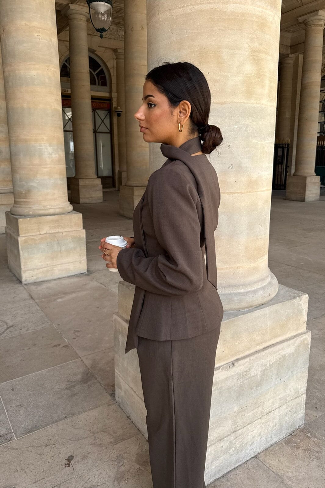 Dunkelbrauner Blazer von BYIC mit V-Ausschnitt und Slim Fit-Passform. Der Blazer hat einen Bindegürtel, der in der Taille oder als Schal getragen werden kann, und wird vorne mit dunkelbraunen Knöpfen geschlossen.