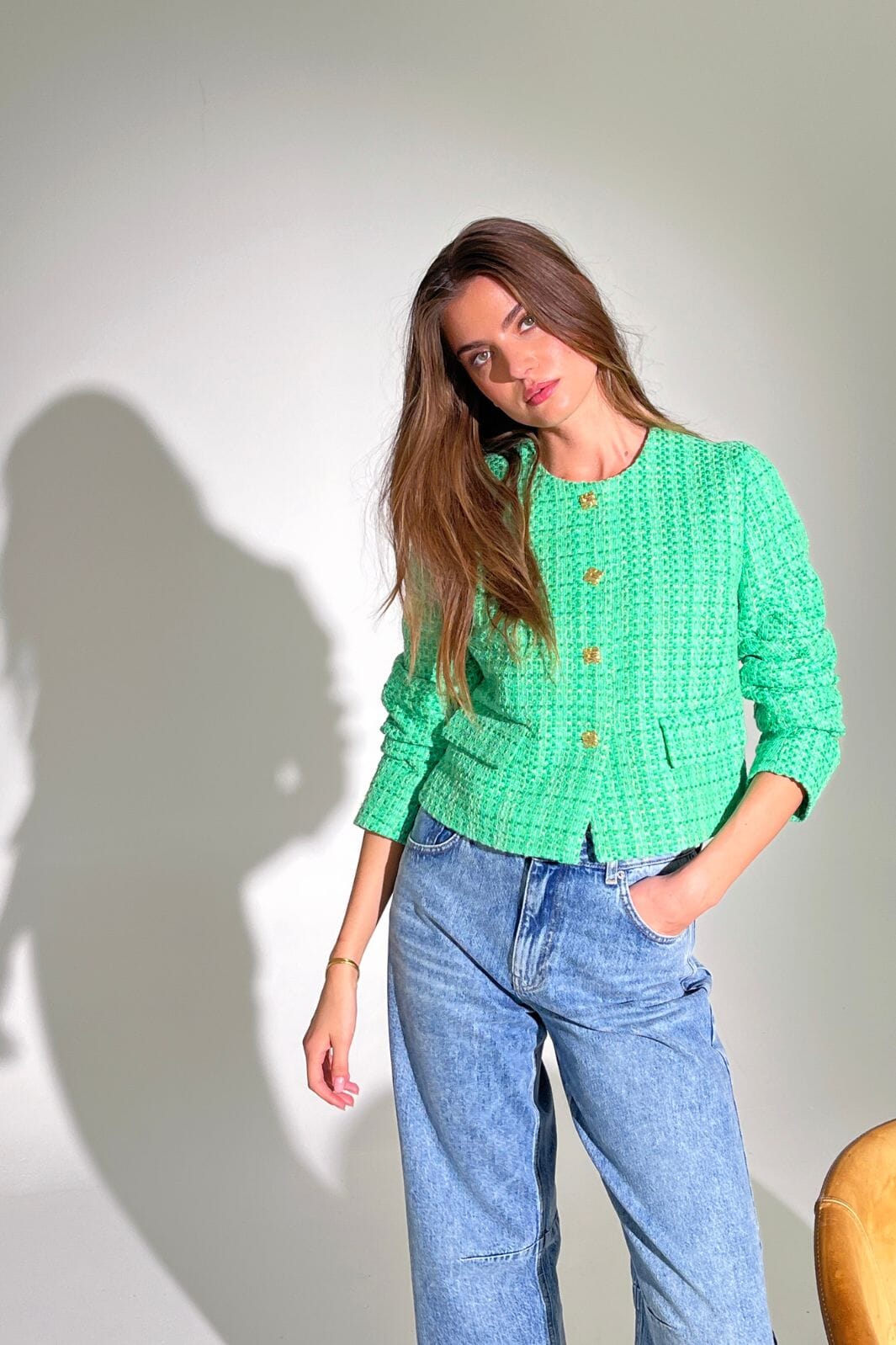 Grüne Bouclé-Jacke von Co´Couture mit vier goldfarbenen Knöpfen und zwei Fronttaschen mit Klappe. Die Jacke hat einen runden Halsausschnitt und lange Ärmel.