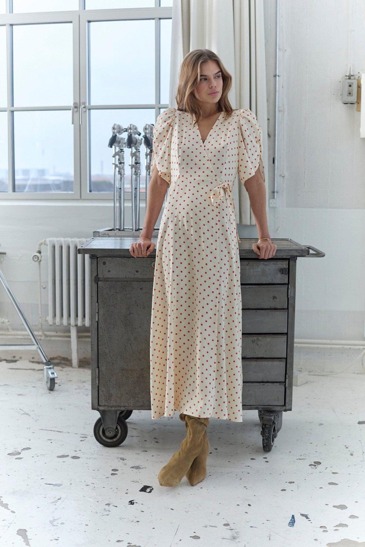 Wickelkleid von Co´Couture in Weiß mit roten Punkten. Das Kleid hat Puffärmel und einen V-Ausschnitt, der einen femininen Ausdruck verleiht.