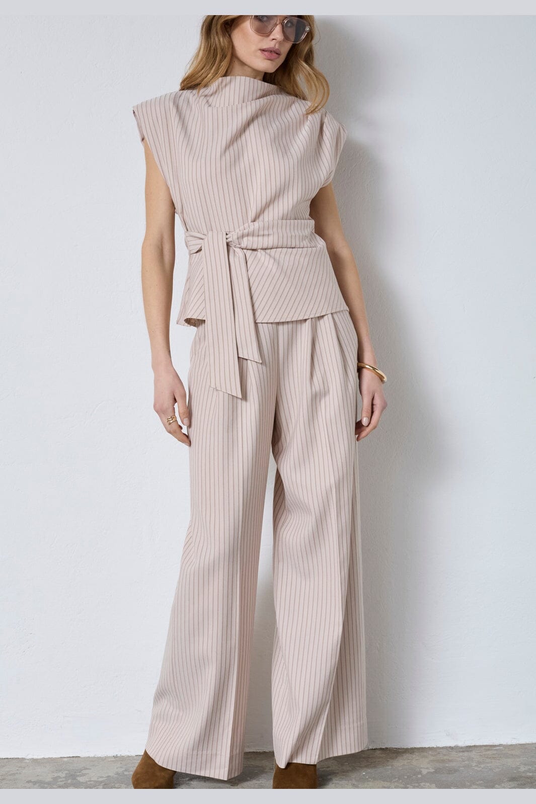 Ärmlose Top von Co´Couture mit vertikalen Streifen in einem hellbeigen Farbton. Das Top hat einen hohen Halsausschnitt und ein Bindeband in der Taille.