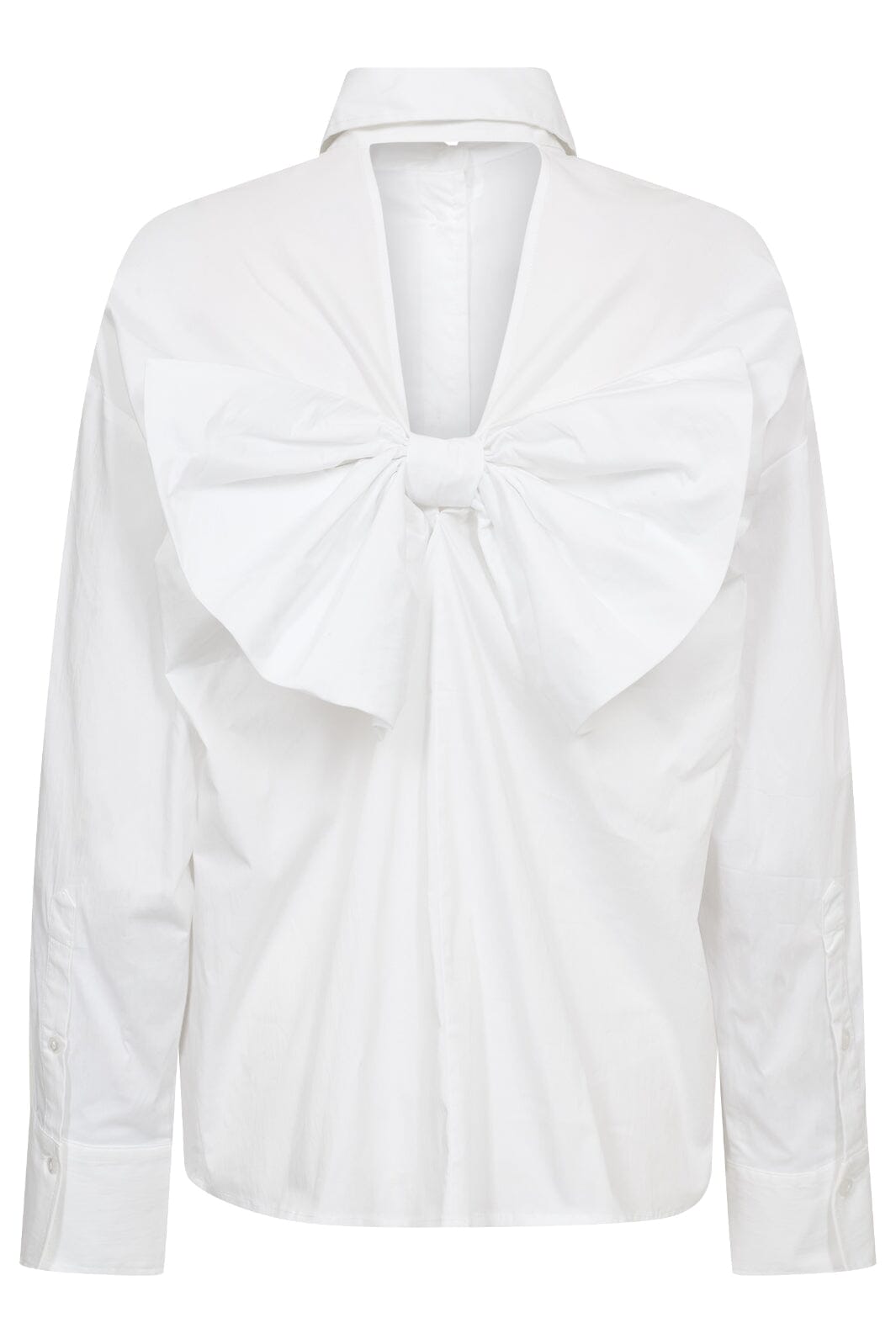Weiße Bluse von Co'Couture mit einer großen Schleife auf dem Rücken und offenem Rücken. Sie kombiniert klassische Blusendetails mit einem markanten Rückendesign.