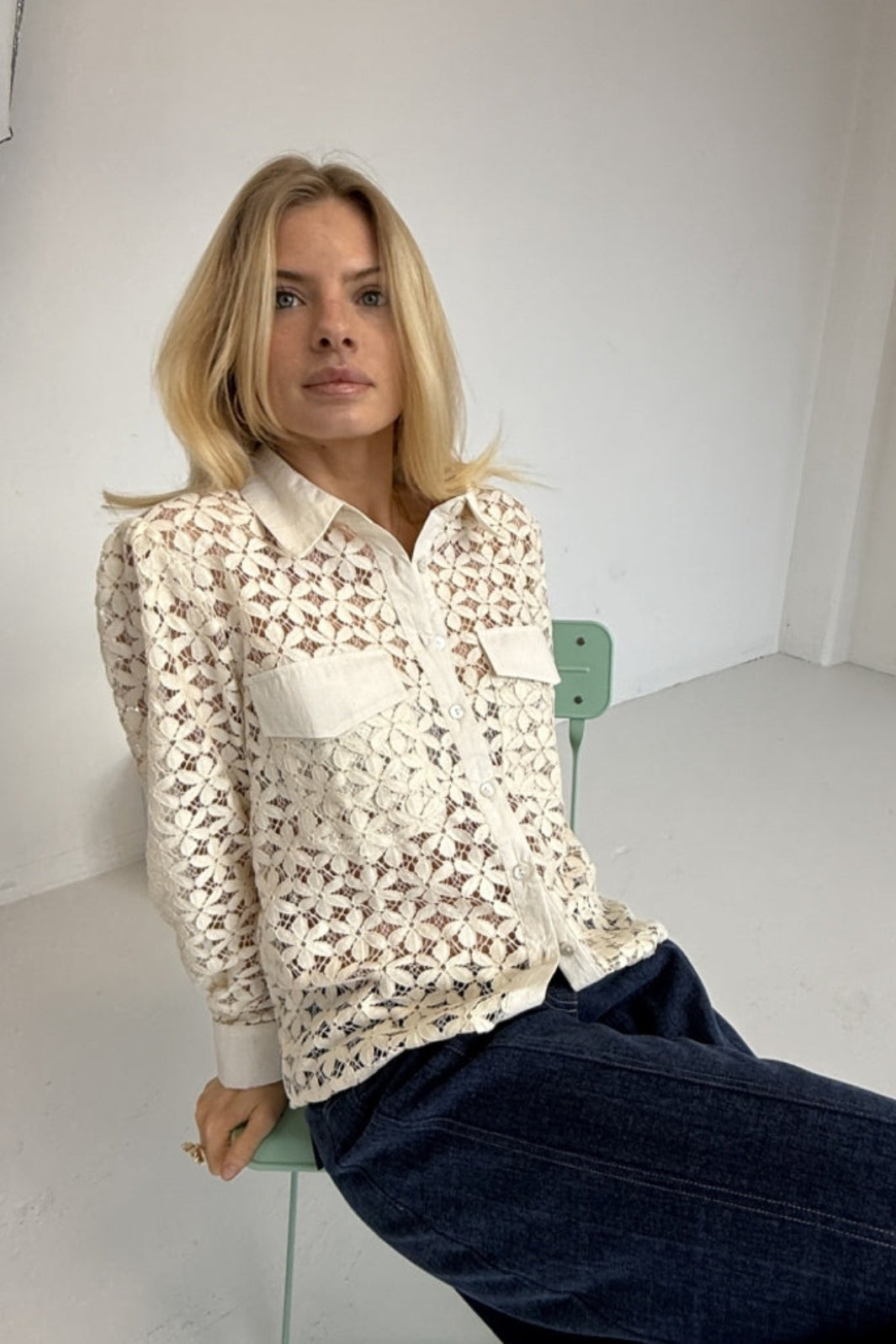 Spitzenbluse von Continue in Off-White, aus 100% Baumwolle. Die Bluse hat ein blumenartiges Spitzenmuster und zwei Fronttaschen.