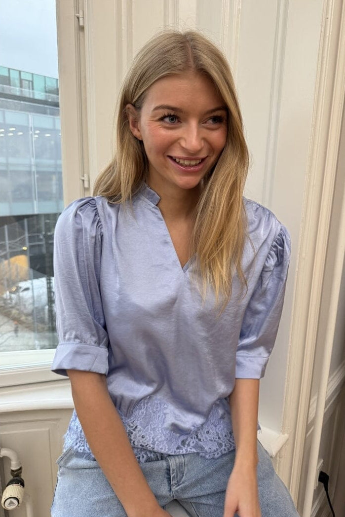 Hellblaue Bluse von Continue, gefertigt aus Polyester und Viskose. Die Bluse hat einen V-Ausschnitt, 3/4-Ärmel und Spitzendetails am Saum.