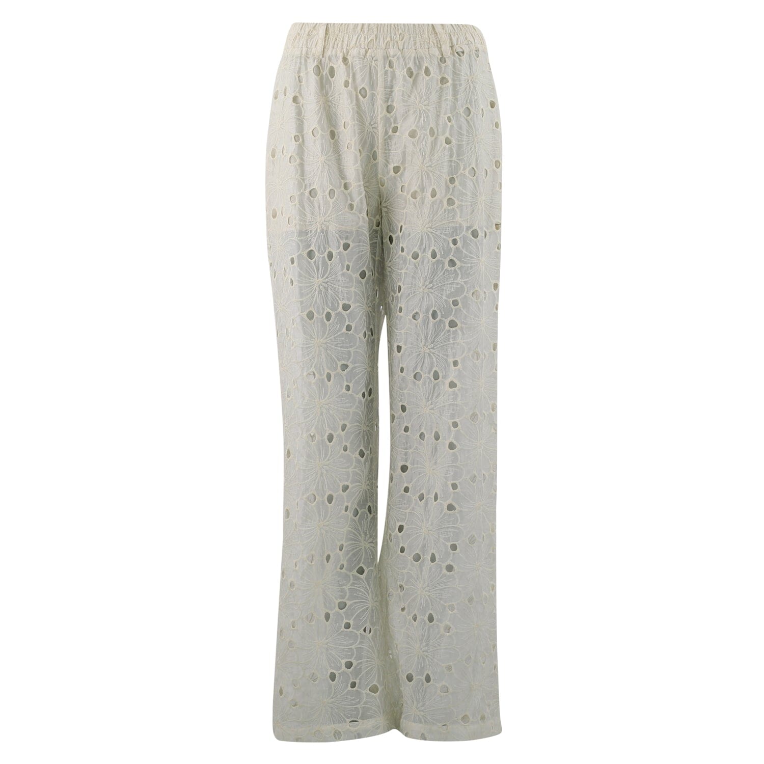 Langer Jumpsuit von Continue in off-white Spitze mit Blumenmuster. Er hat kurze Ärmel, eine Knopfleiste vorne und ein Bindeband in der Taille, das nach Wunsch angepasst werden kann.