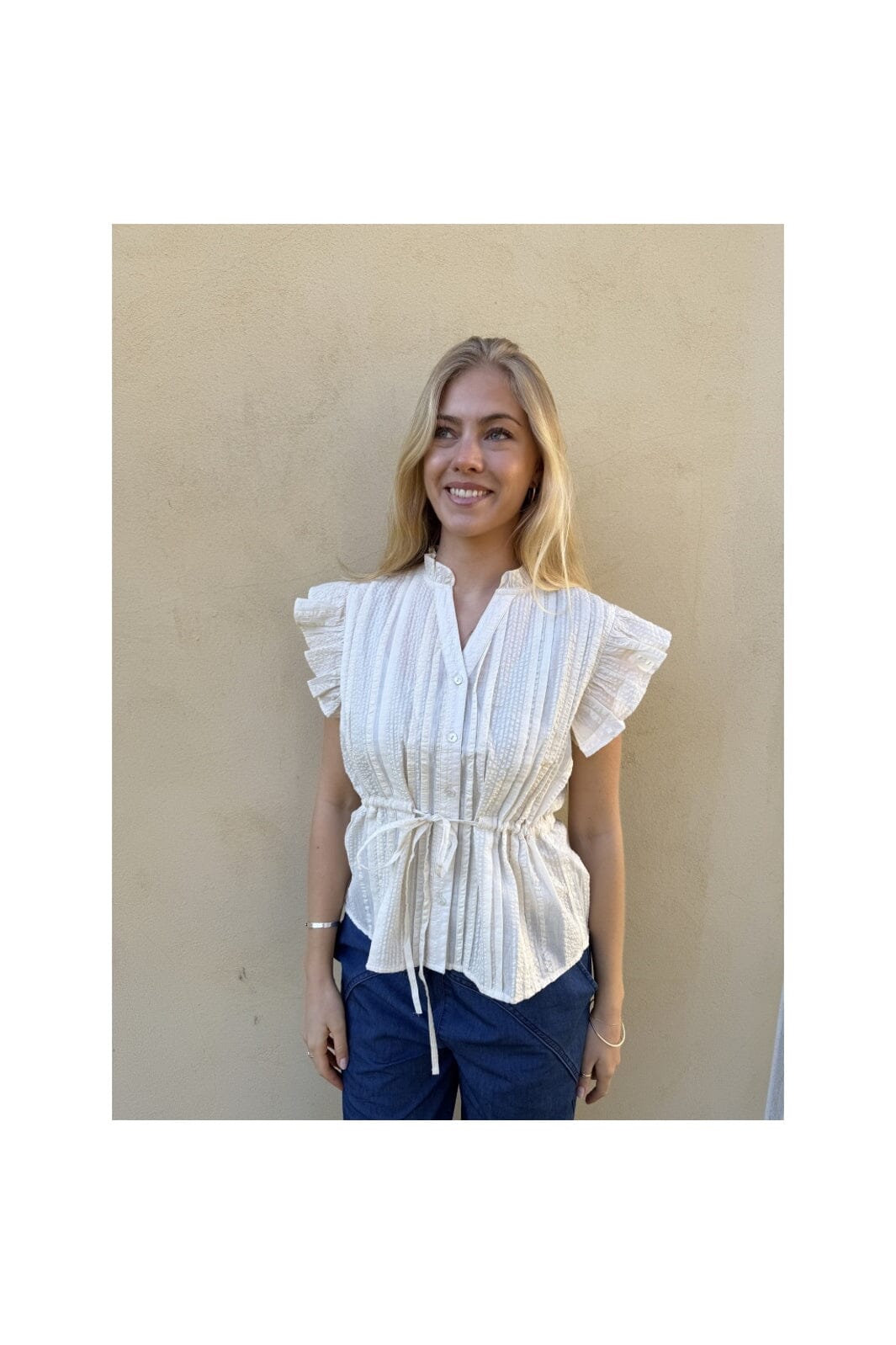 Cremefarbene Bluse von Continue, gefertigt aus Viskose und Polyester. Die Bluse hat kurze Volantärmel, eine Knopfleiste vorn und ein Bindeband in der Taille.