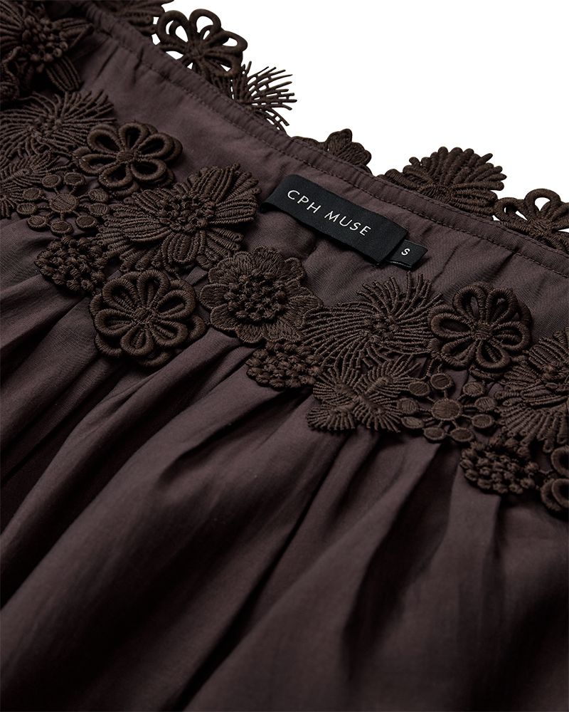 Braune Bluse von Copenhagen Muse, gefertigt aus 85% Lyocell und 15% Polyester. Die Bluse hat einen Off-Shoulder-Stil mit Blumenstickerei am Ausschnitt und Rüschen.