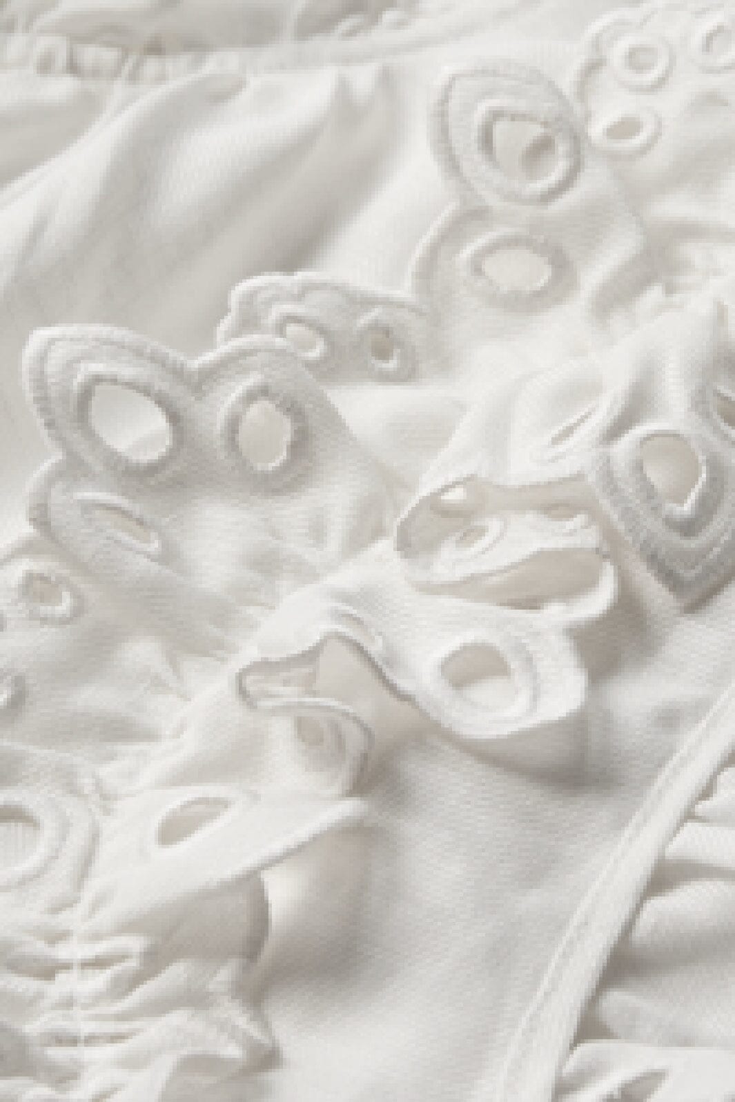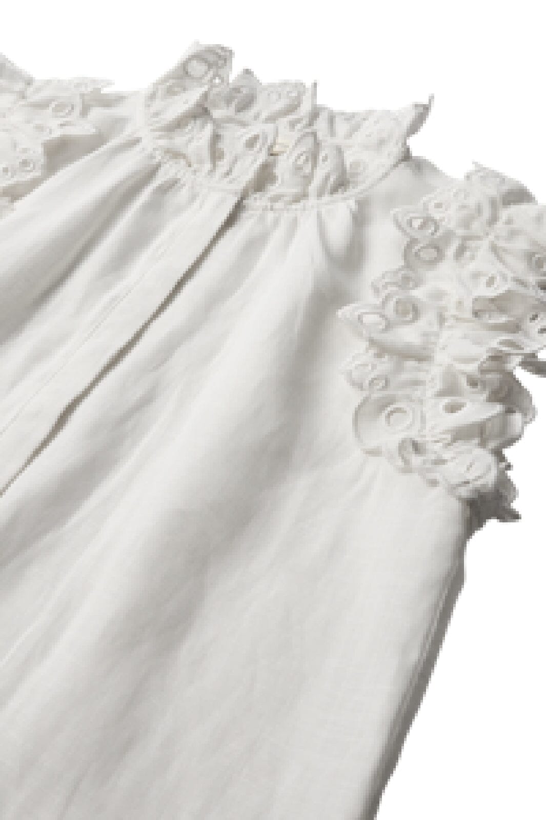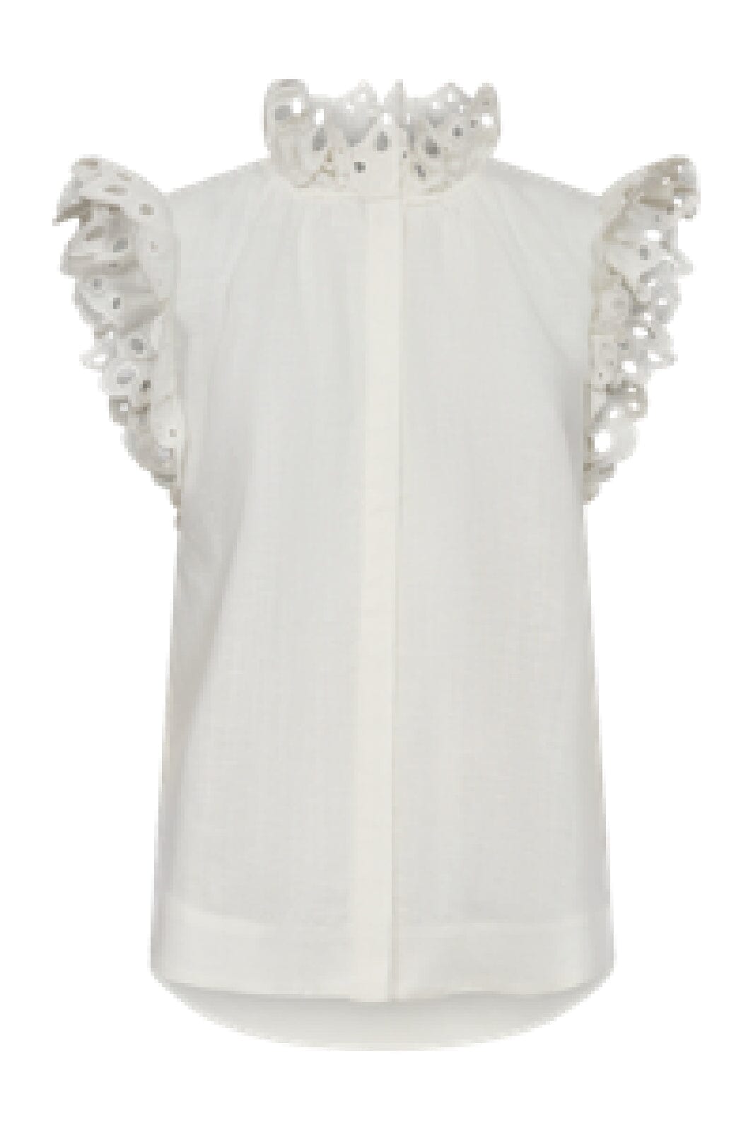 Weißes Hemd von Copenhagen Muse mit hohem, gerafftem Kragen und Spitzenbesatz an den Ärmeln. Das Hemd hat eine Knopfleiste vorne und besteht aus leichtem Material mit feinen Details.