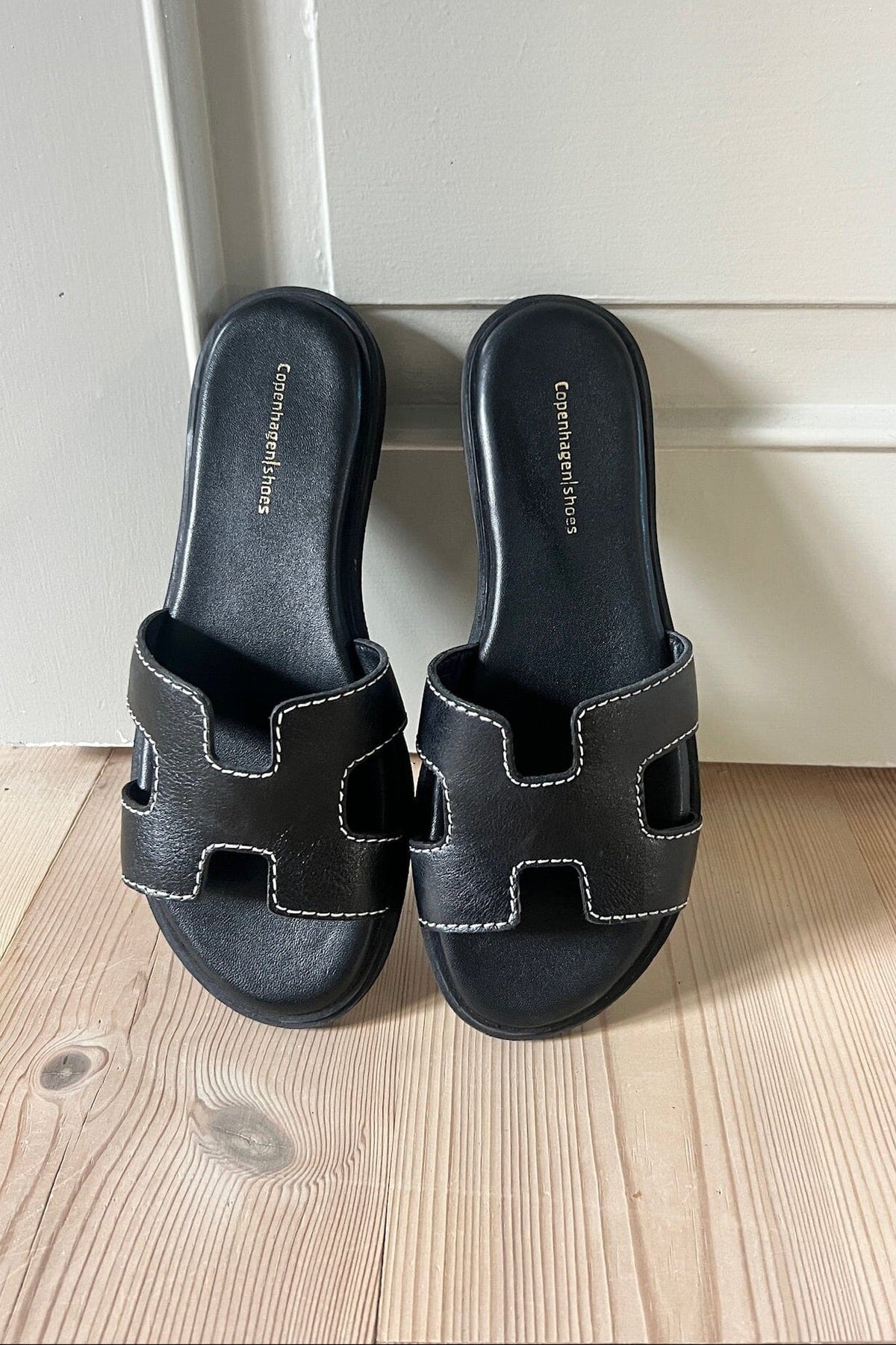Schwarze Sandalen von Copenhagen Shoes, hergestellt aus Leder. Die Sandalen haben einen breiten Riemen mit ausgeschnittenen Partien und sichtbaren Kontrastnähten.