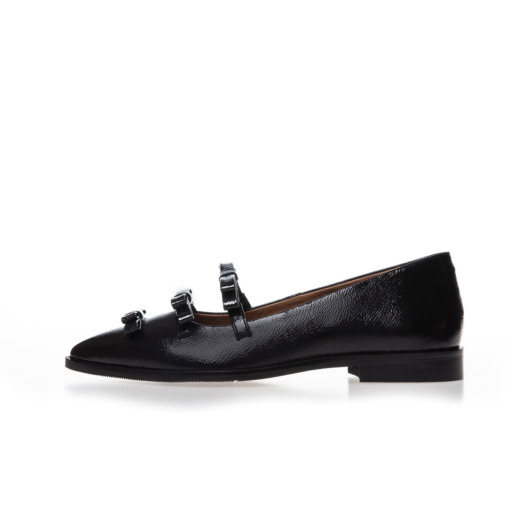 Schwarze Lackschuhe von Copenhagen Shoes mit spitzer Zehenpartie und zwei Riemen über dem Spann. Die glänzende Oberfläche verleiht den Schuhen einen polierten Look.
