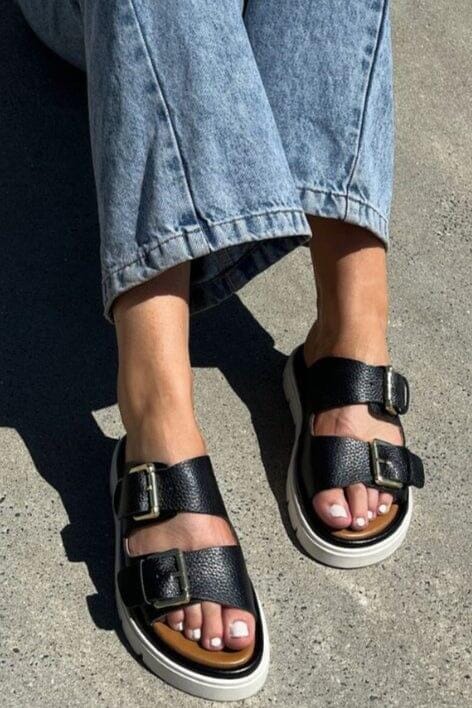 Schwarze Sandalen von Copenhagen Shoes aus Leder mit einer markanten Plattformsohle. Die beiden verstellbaren Schnallen und die robuste Sohle verleihen den Sandalen ihren charakteristischen Ausdruck.