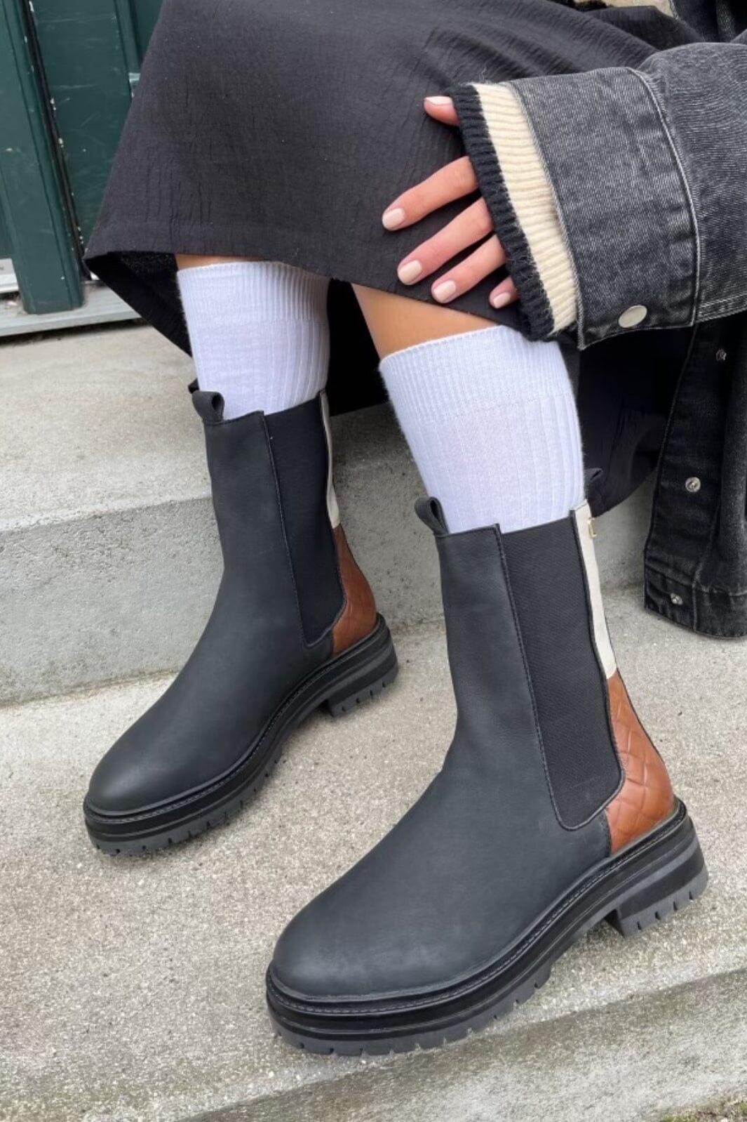 Lederstiefel von Copenhagen Shoes mit schwarz, braun und beige Farbkombination. Die Stiefel haben einen Blockabsatz und elastische Verschlüsse an den Seiten.