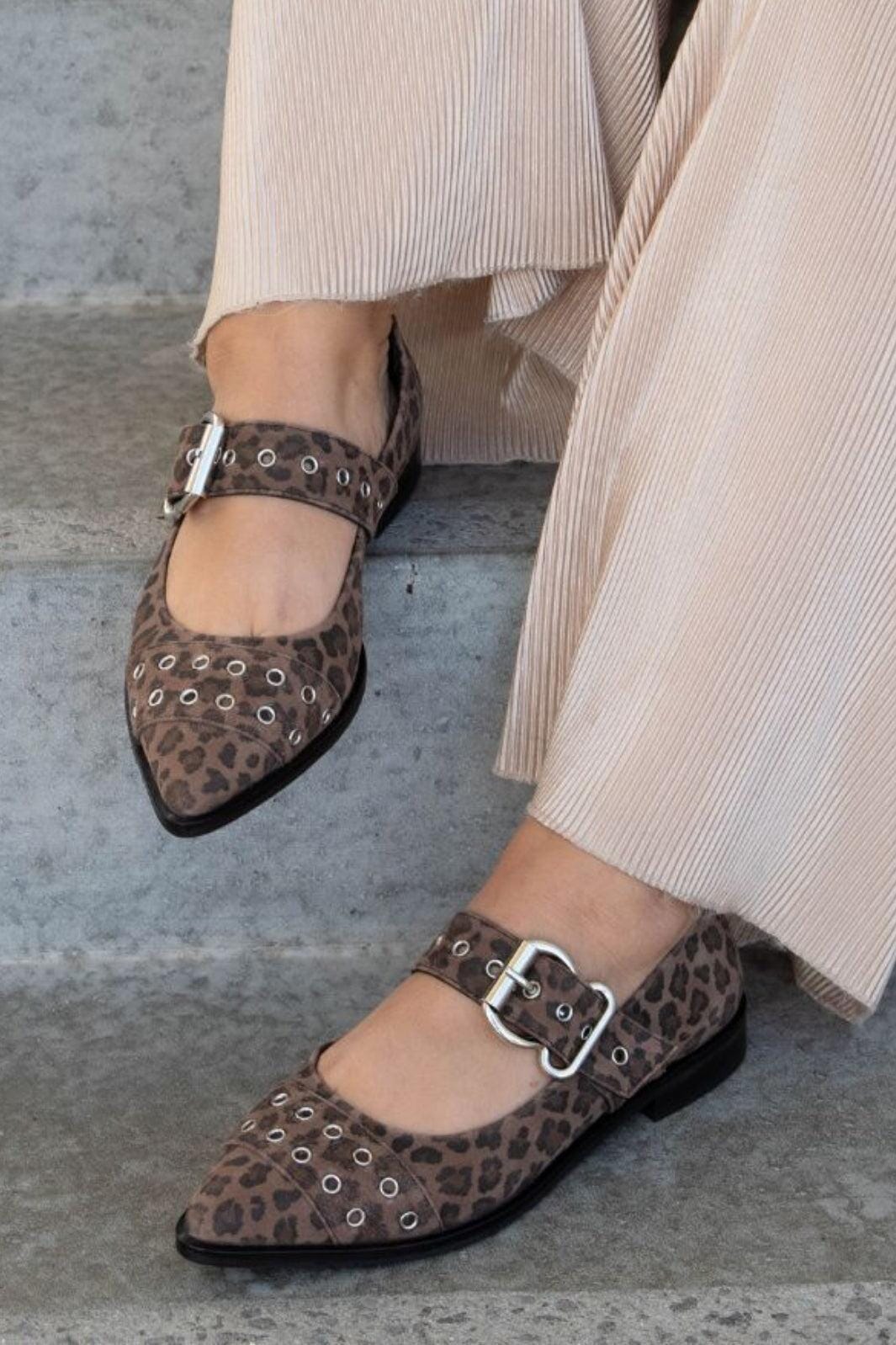 Wildlederschuhe von Copenhagen Shoes mit braunem Leopardenmuster. Der Schuh hat eine spitze Zehe und eine Schnallenverschluss mit Nieten als Detail. Der flache Absatz bietet guten Halt.