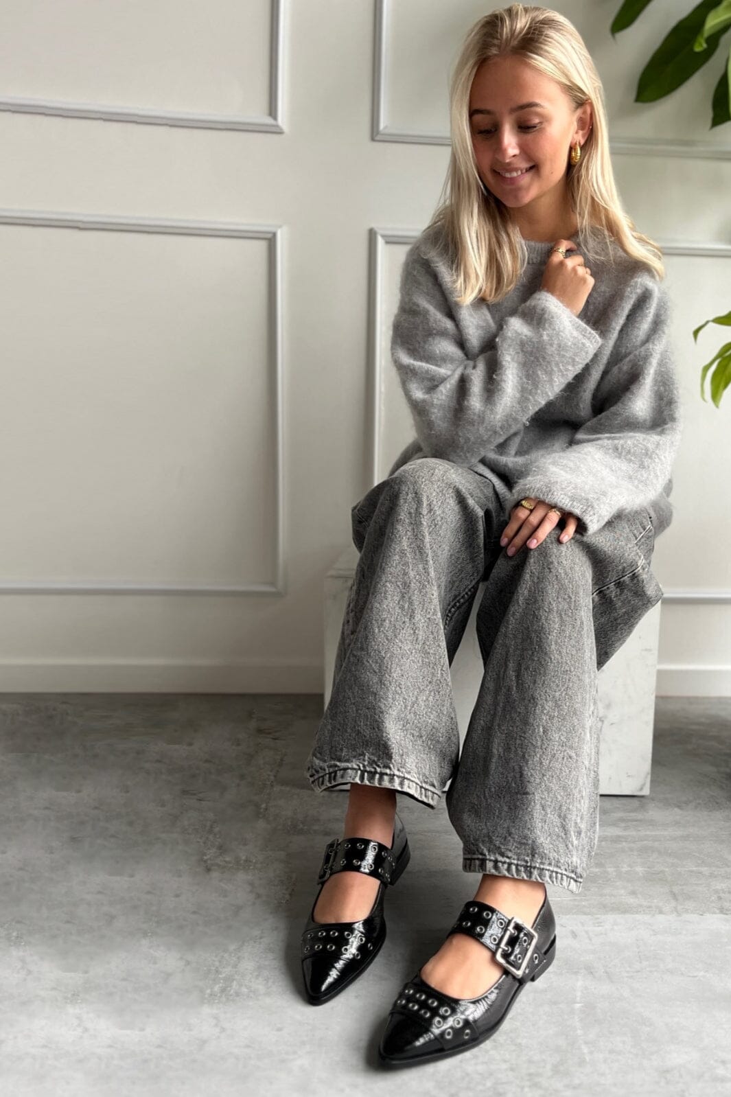 Schwarze Ballerinas von Copenhagen Shoes aus glänzendem Lackmaterial mit spitzem Zeh und Schnalle. Die Nieten an dem Riemen verleihen dem Schuh einen markanten Ausdruck.