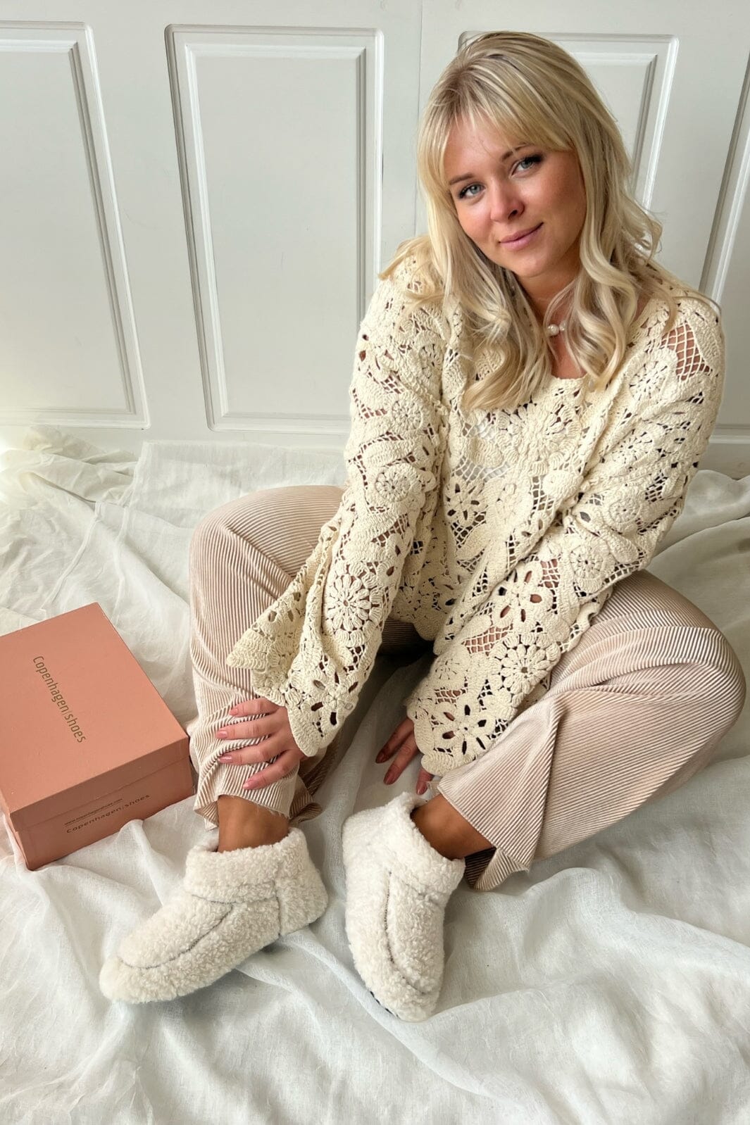 Weiche Hausschuhe von Copenhagen Shoes in Off-White-Tönen. Sie haben eine flauschige Oberfläche aus synthetischem Material und flexible Gummisohlen für den Innenbereich.