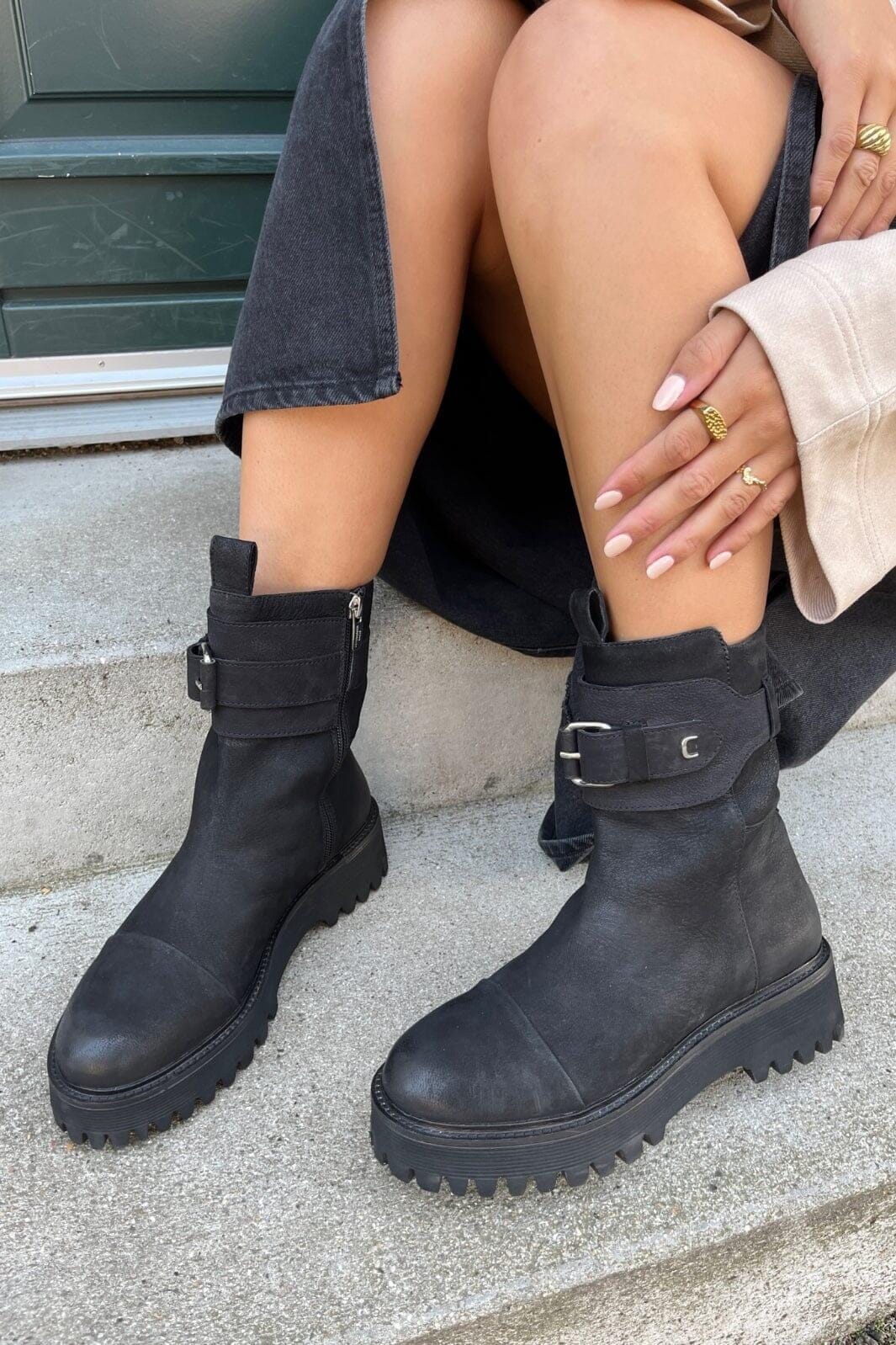 Schwarze Stiefeletten von Copenhagen Shoes aus Nubuk mit robuster Sohle. Die Stiefel haben eine robuste Konstruktion mit Reißverschluss und Schnalle an der Seite.