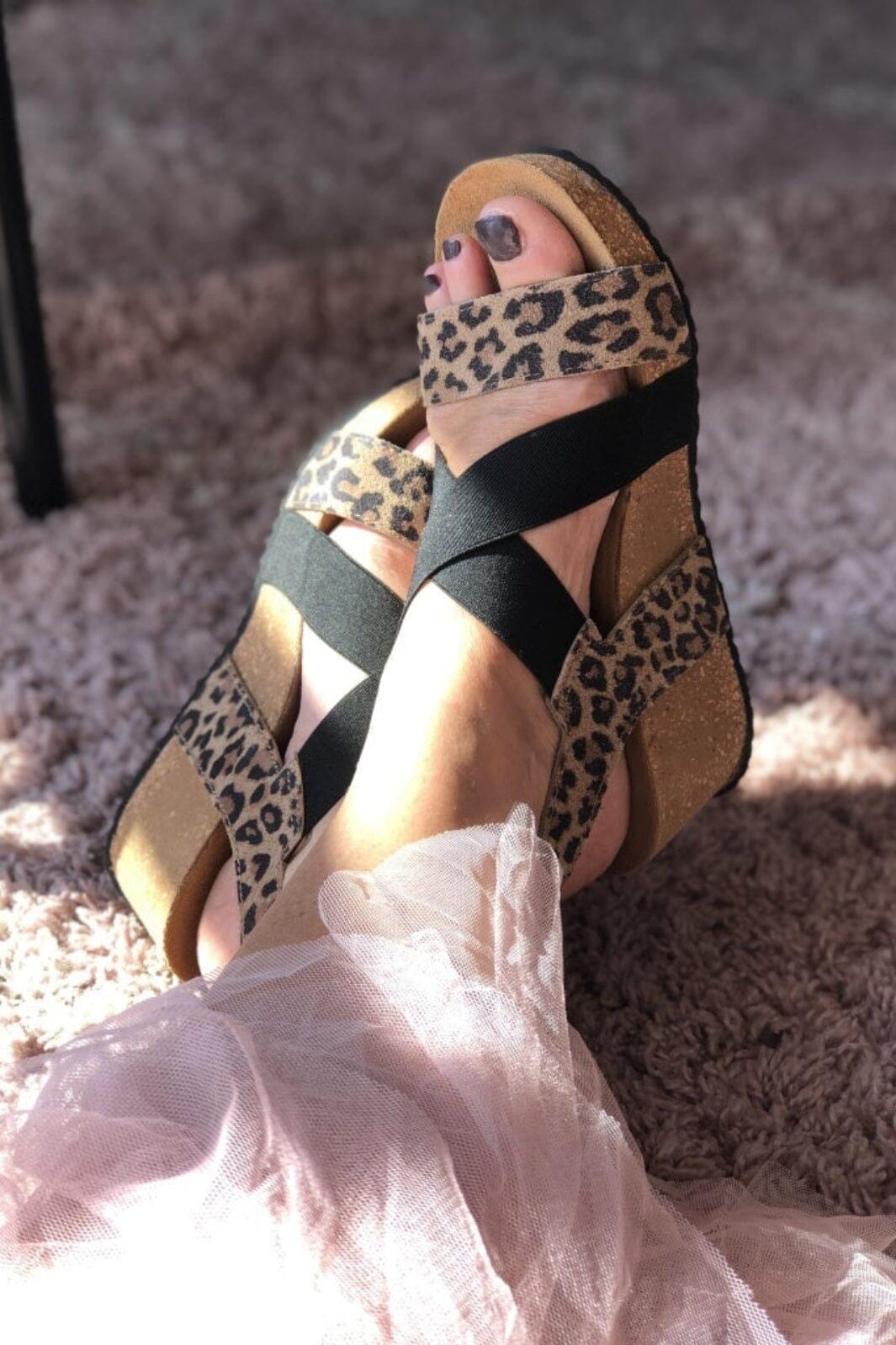 Sandalen von Copenhagen Shoes mit braunem Leopardenmuster und schwarzen, gekreuzten Riemen. Die Sandale besteht aus geschmeidigem, echtem Nubukleder.