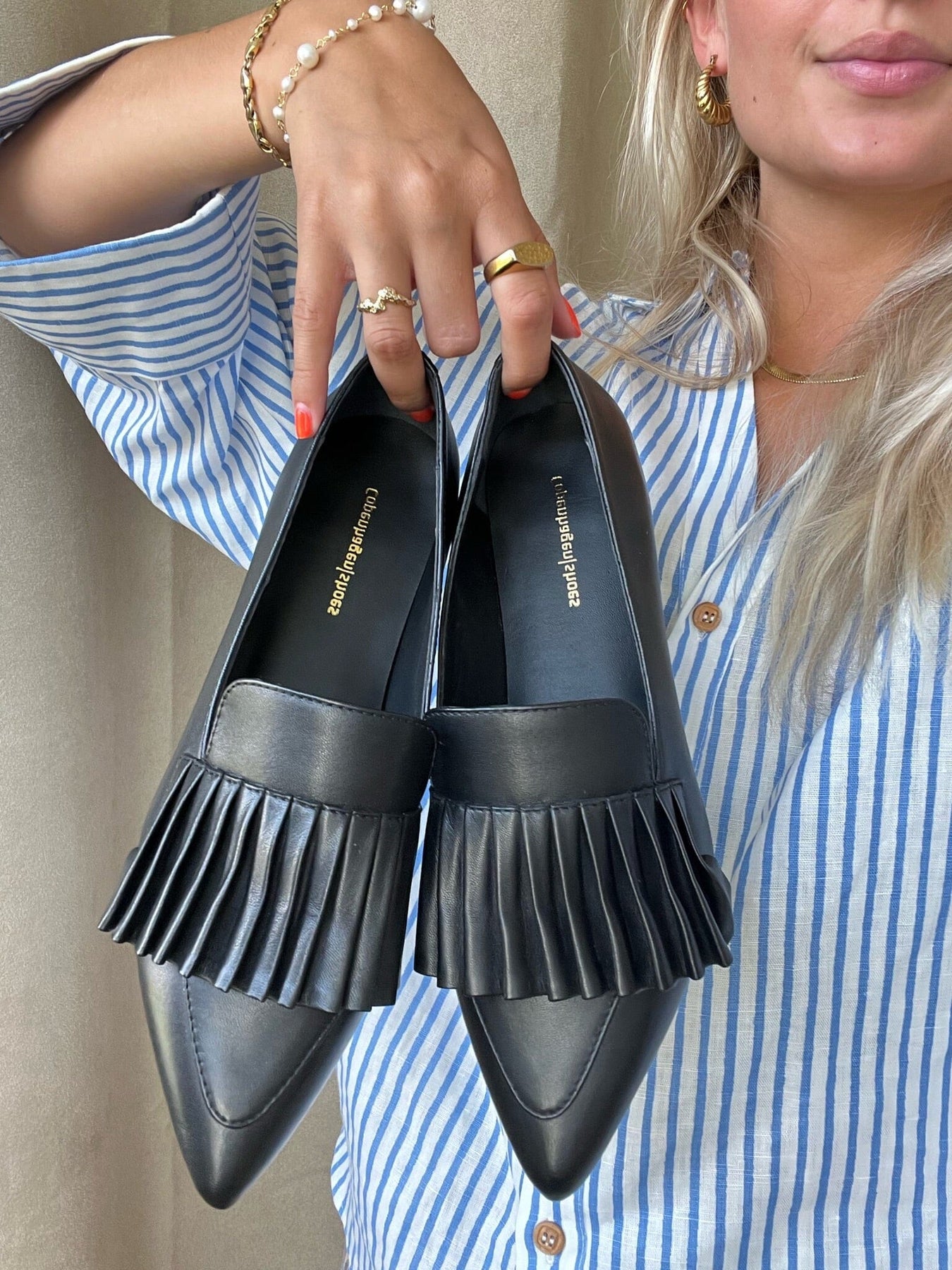 Schwarze Loafer von Copenhagen Shoes aus Leder mit spitzem Zeh. Die plissierte Vorderseite verleiht dem Schuh eine schöne Detailarbeit, die sowohl zu formellen als auch zu festlichen Anlässen getragen werden kann.