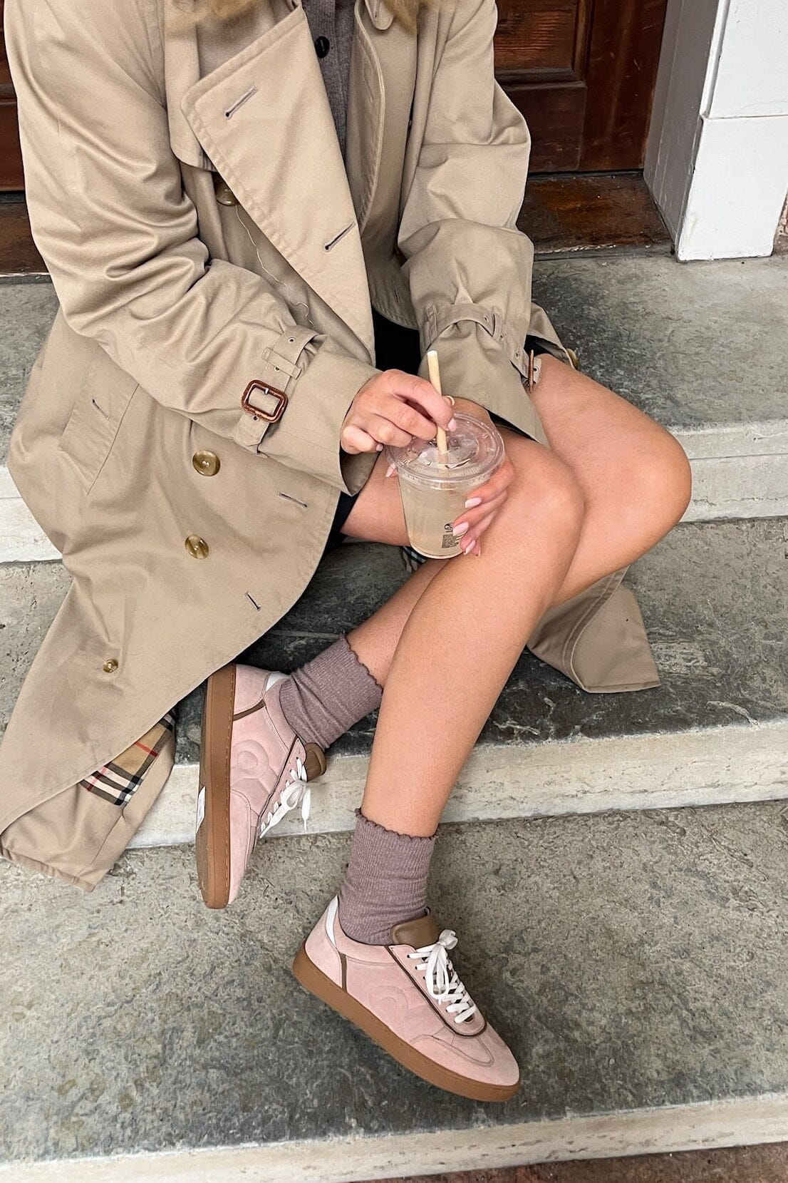 Rosa Sneaker von Copenhagen Shoes, aus weichem Wildleder mit weißen Schnürsenkeln und brauner Sohle. Dekorative Nähte an der Seite.