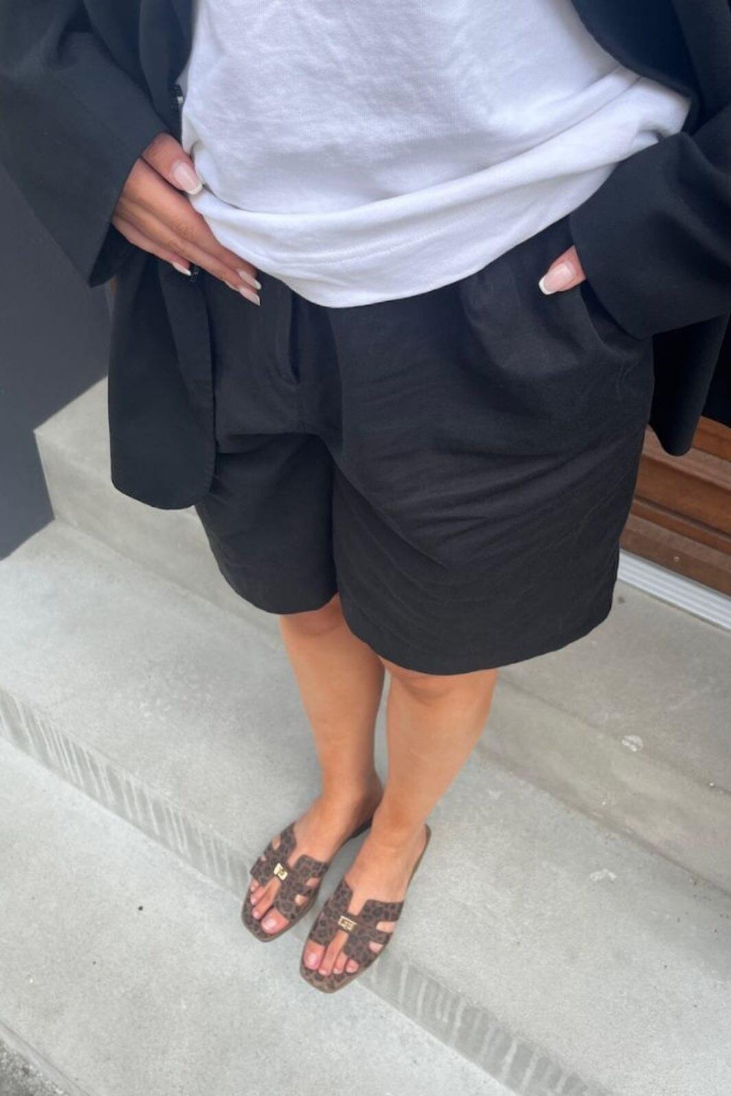 Sandalen von Copenhagen Shoes aus Wildleder mit Leopardenmuster. Die Sandalen haben eine flache Sohle und ein goldfarbenes Detail am Riemen.