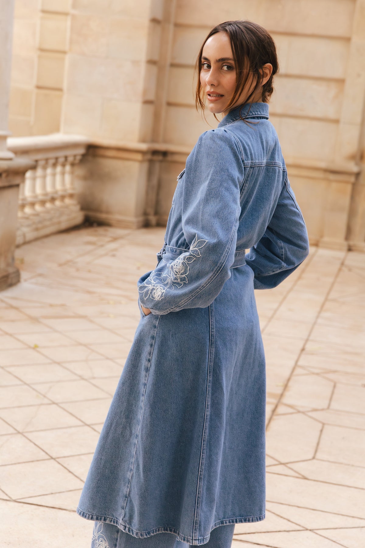 Mittlere blaue Denimkleid von Cras mit Blumenstickerei am unteren Teil. Das Kleid hat einen Hemdkragen, Knöpfe bis nach unten und ein Bindeband in der Taille.