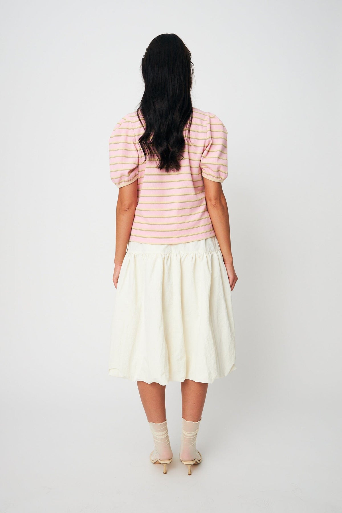 Gestreiftes Polo-T-Shirt von Cras mit rosa und gelben Streifen. Das T-Shirt hat einen hellen Kragen mit Perlenknopfdetails und kurze Ärmel mit Slim-Fit-Passform.