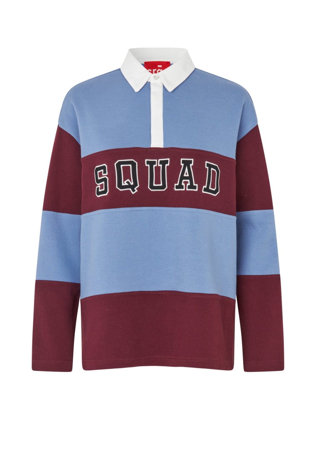 Polo-Bluse von Cras mit Farbblöcken in Hellblau und Bordeaux. Die Bluse hat einen SQUAD-Print auf der Brust und einen klassischen Polokragen.