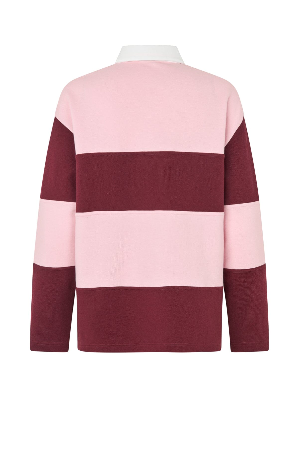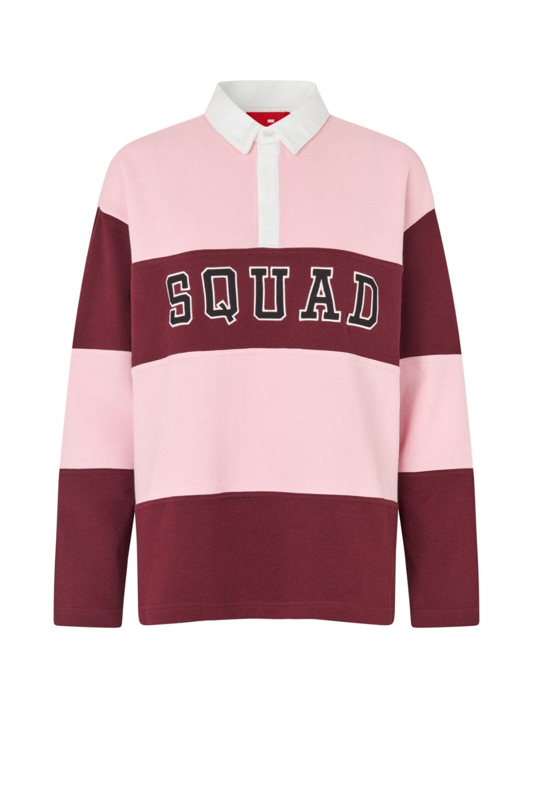 Polo-Bluse von Cras in Rosa mit pink- und dunkelbraunfarbenen Streifen. Die Bluse hat einen weißen Kragen und einen SQUAD-Print auf der Brust.