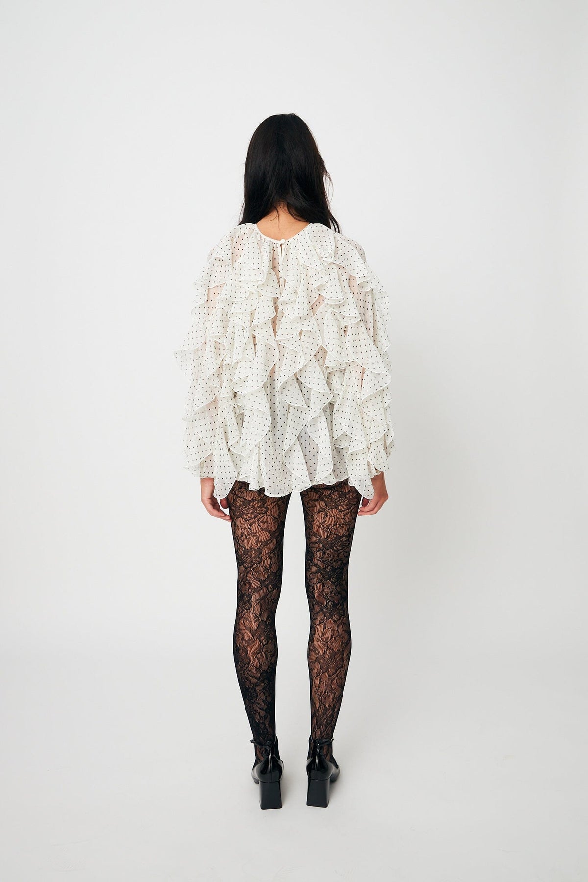 Weiße Bluse von Cras mit kleinen Punkten überall. Die Bluse hat mehrere Lagen von Rüschen sowohl vorne als auch an den Ärmeln, einen runden Halsausschnitt sowie Knöpfe im Nacken und an den Manschetten.