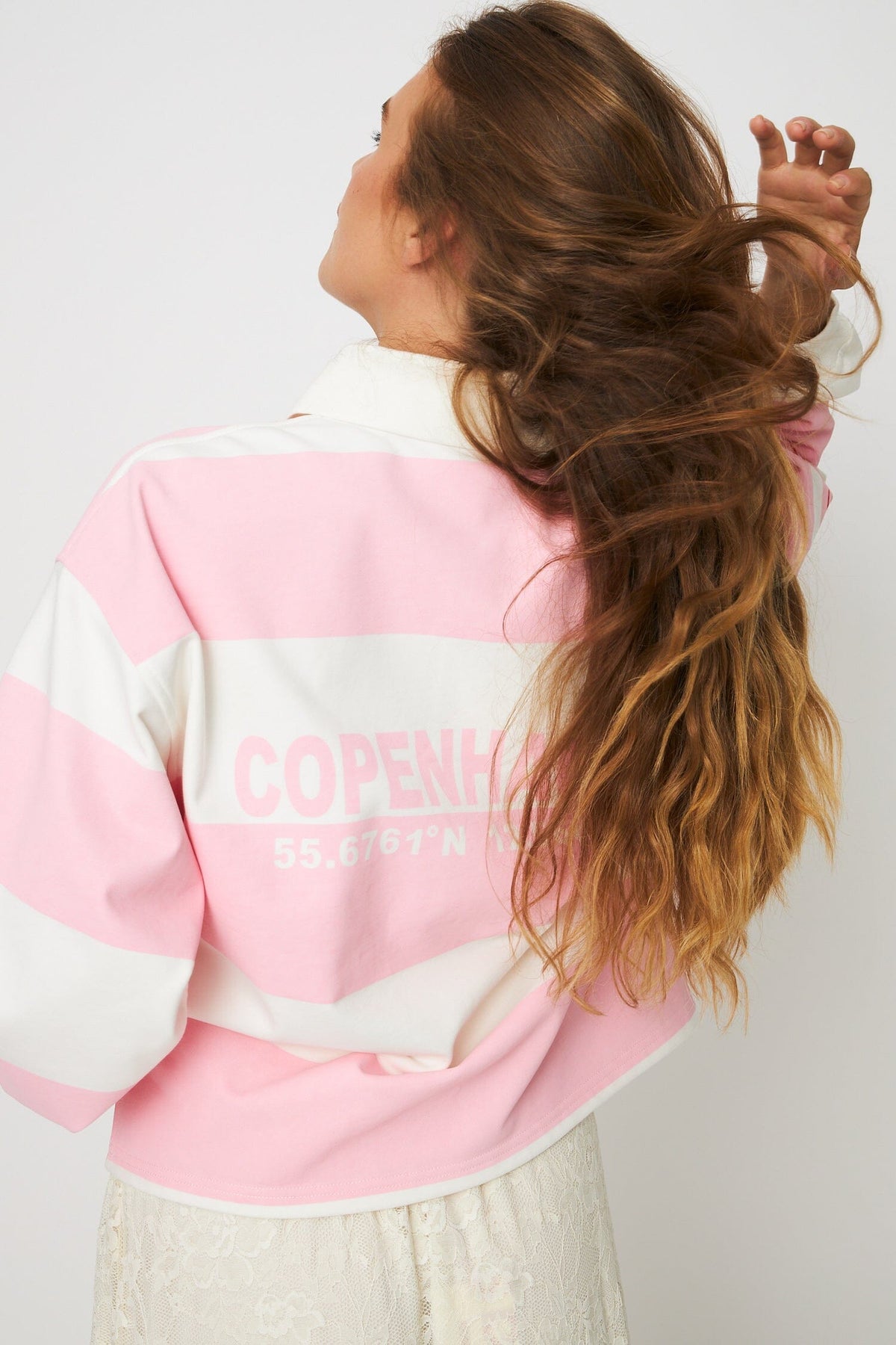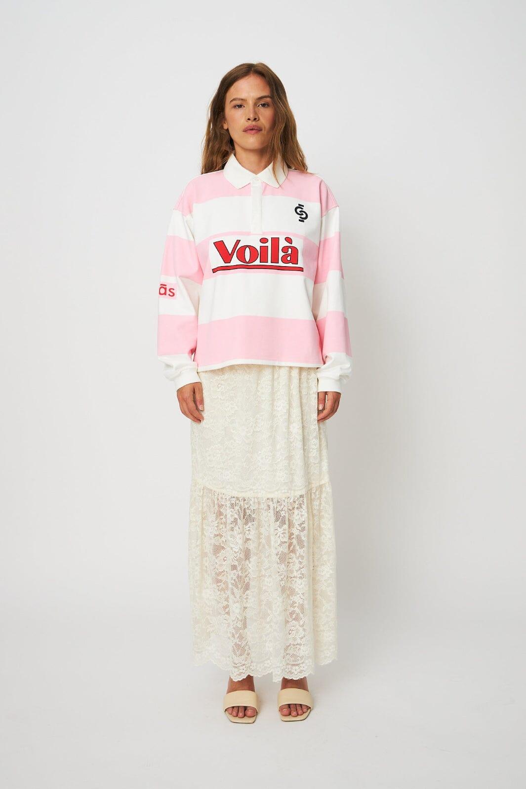 Rosa und weiße Bluse von Cras mit Streifen und Polokragen. Die oversized Bluse hat lange Ärmel und gestickten Voilà-Text auf der Vorderseite. Das Cras-Logo ist am Ärmel sichtbar.