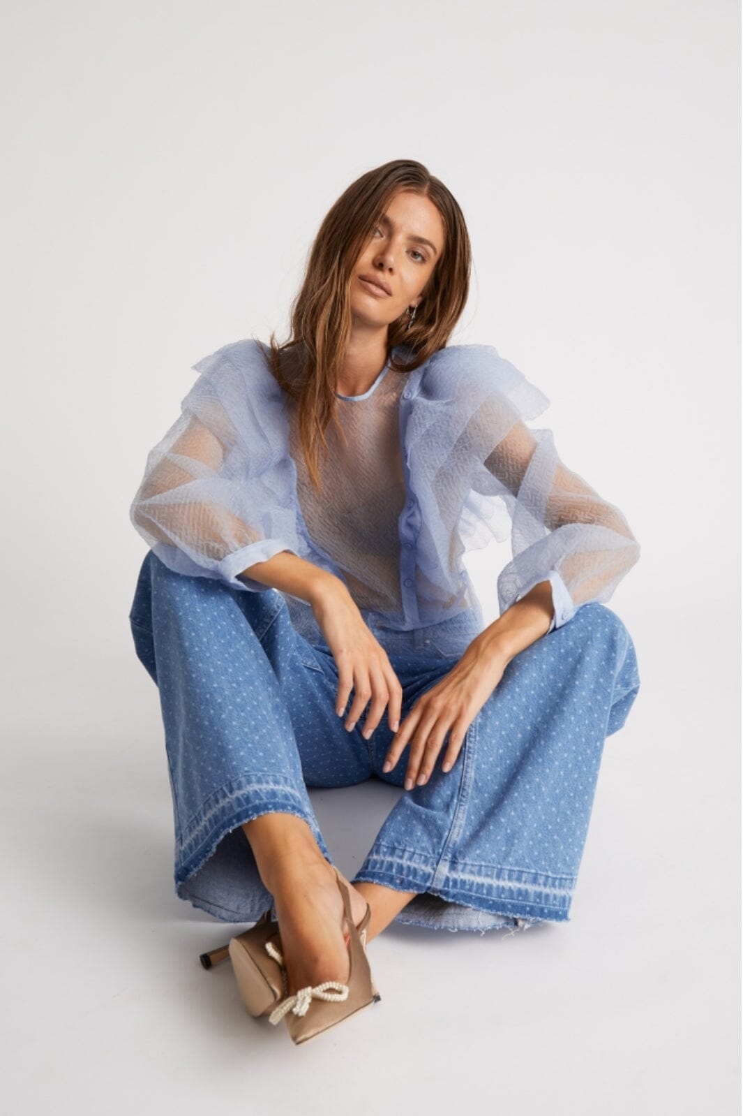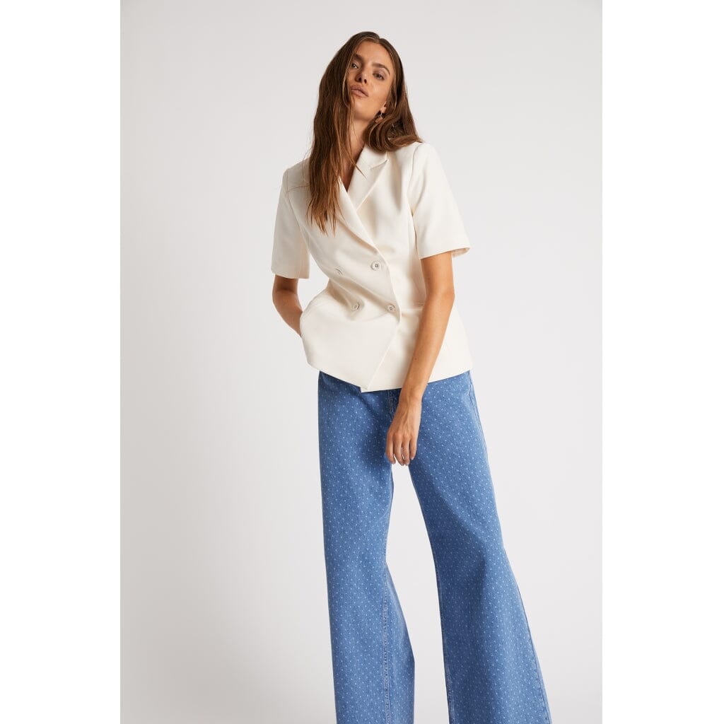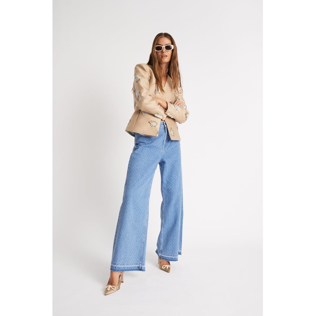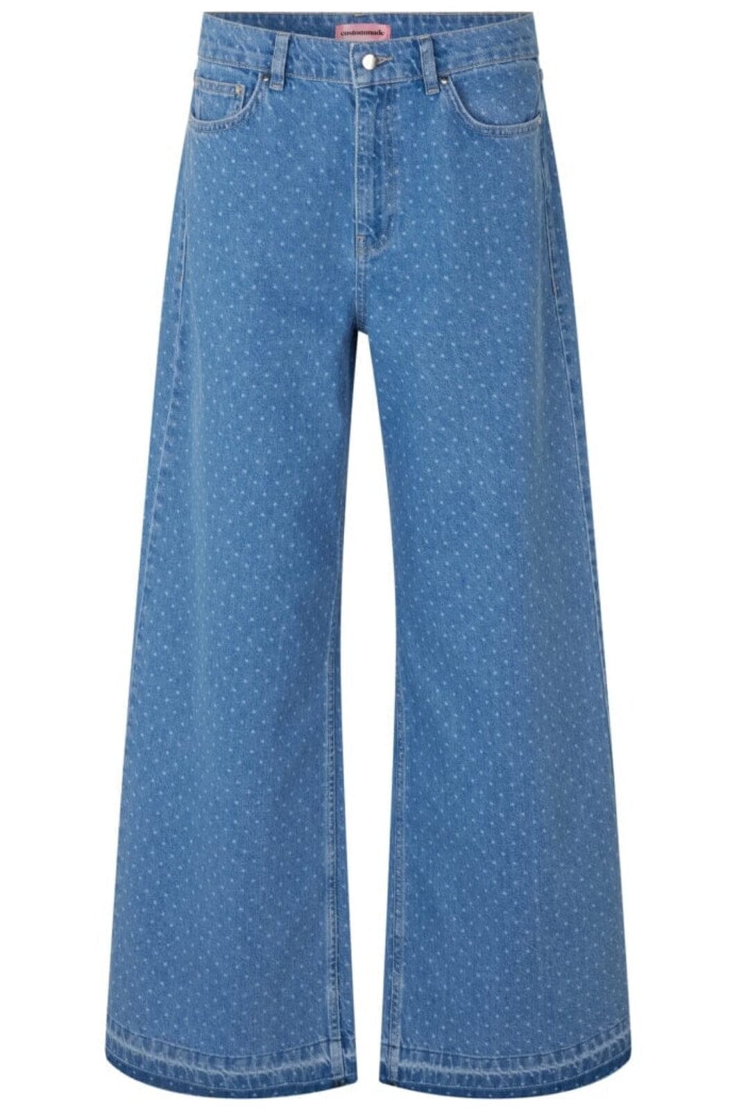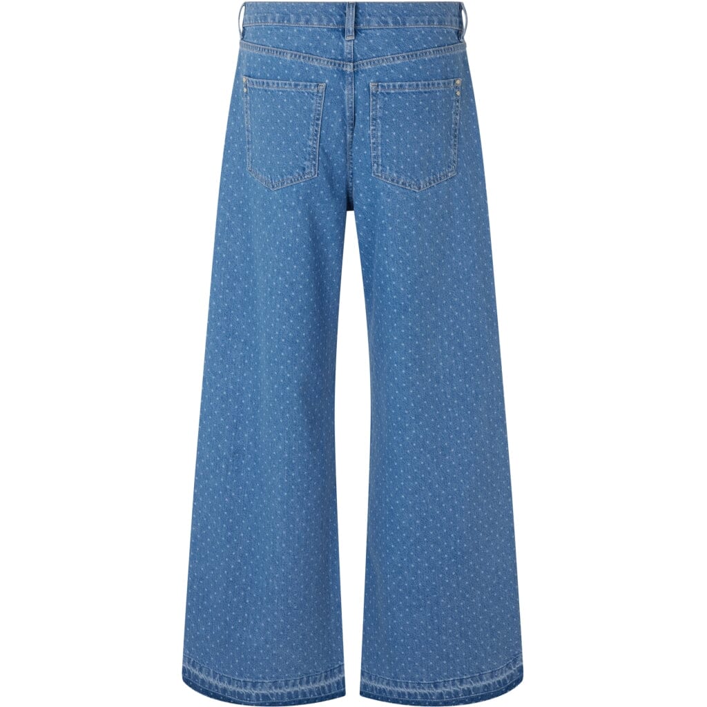 Weite Jeans in Hellblau mit einem gepunkteten Muster. Die Jeans haben eine reguläre Passform und eine Knöchellänge mit einem dezenten Polka-Dot-Design, das den gesamten Stoff bedeckt.
