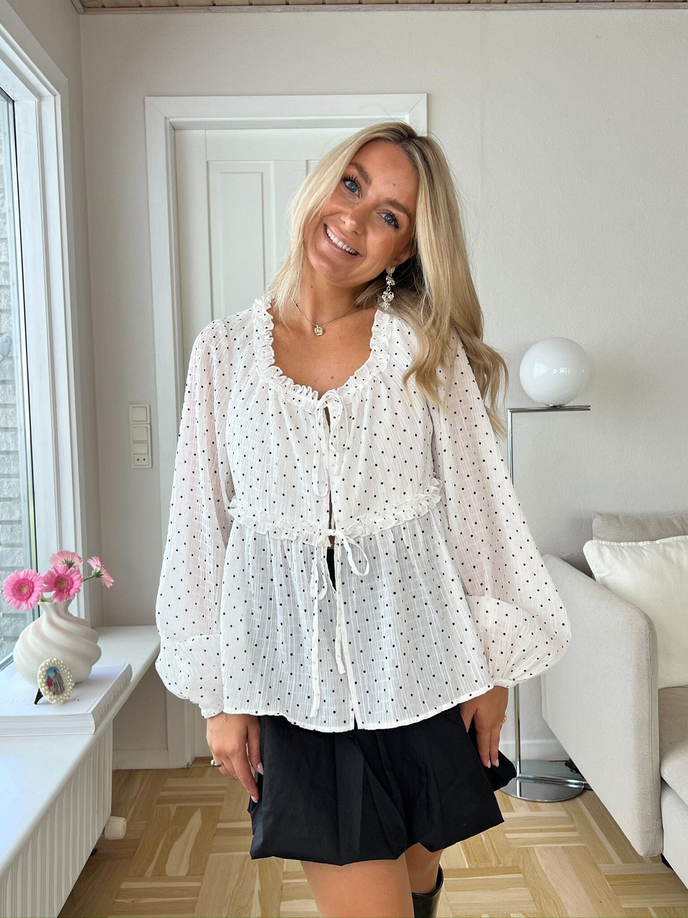 Weiße Bluse mit schwarzen Punkten von Dear Molly. Die Bluse hat lange Ärmel und einen runden Halsausschnitt mit Rüschen.