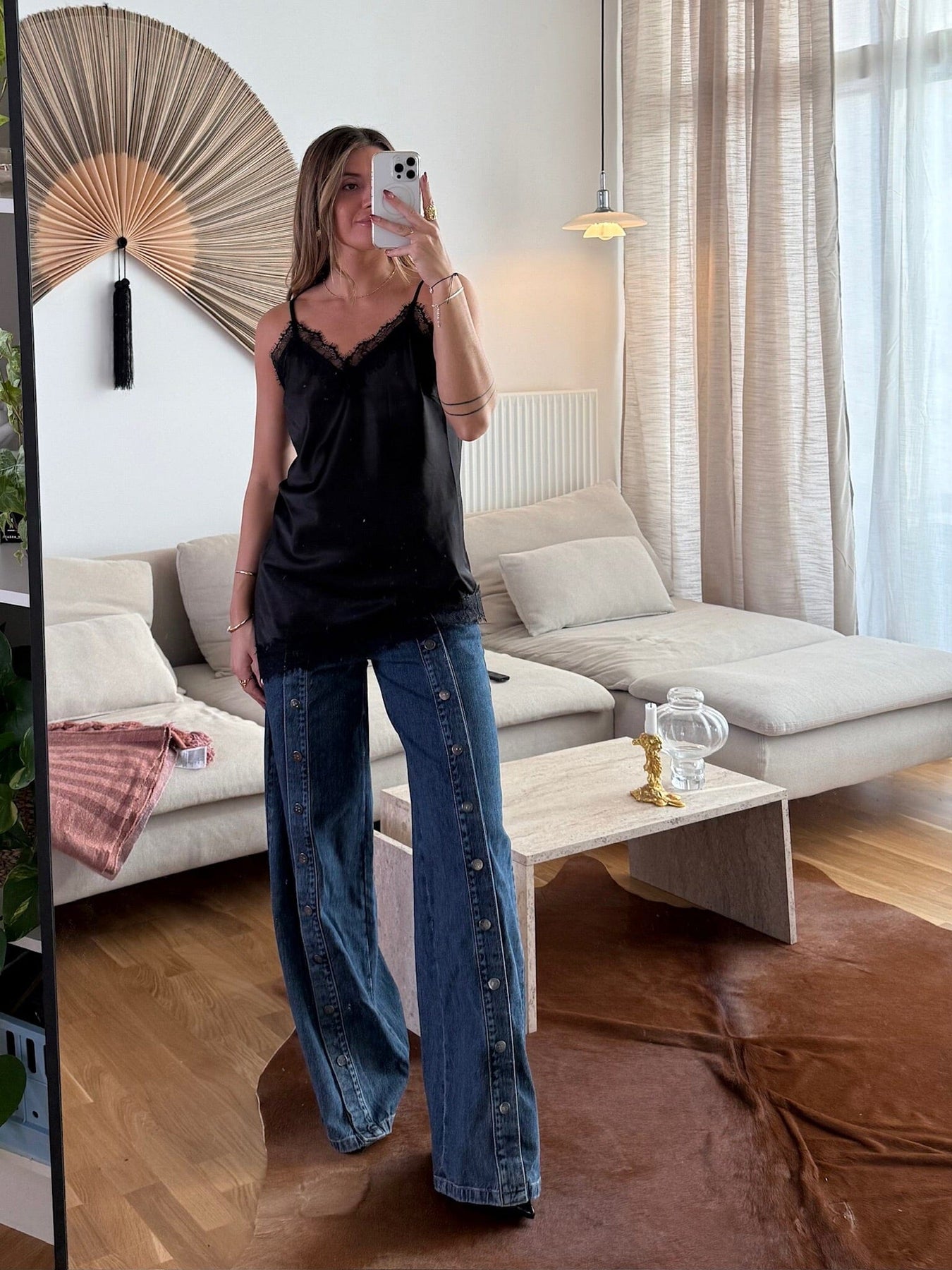 Schwarzes Top von Dear Molly mit Spitze entlang des Ausschnitts und Saums. Das Top hat dünne Spaghettiträger und einen V-Ausschnitt.