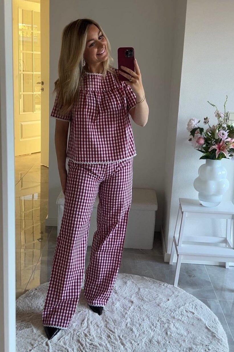 Hose von Dear Molly, aus 100 % Baumwolle in den Farben Bordeaux und Weiß. Das Material ist gewebt und hat ein kariertes Muster.