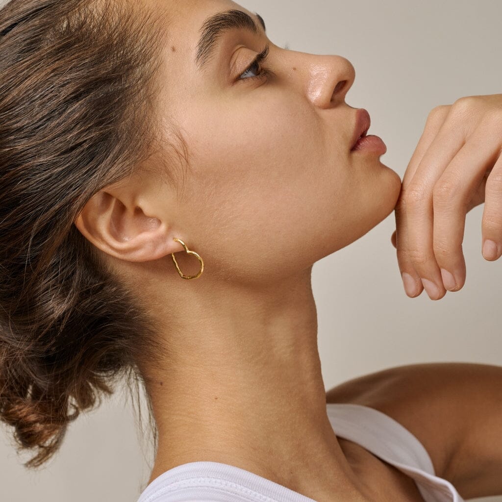 Herzförmige Ohrringe von Enamel Copenhagen. Handgefertigte Hoops aus vergoldetem recyceltem Sterlingsilber mit strukturierter Oberfläche und organischer Form.