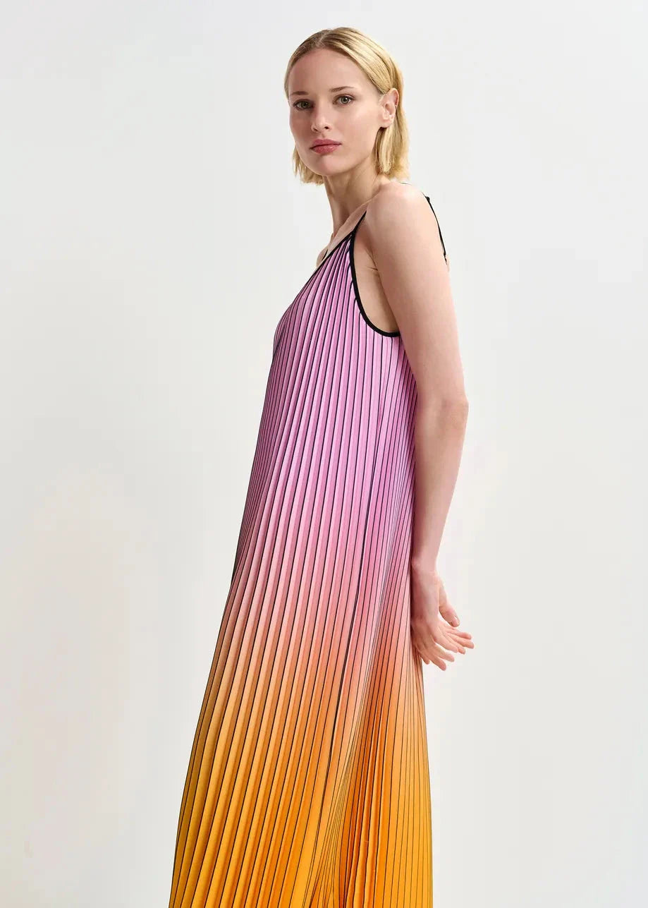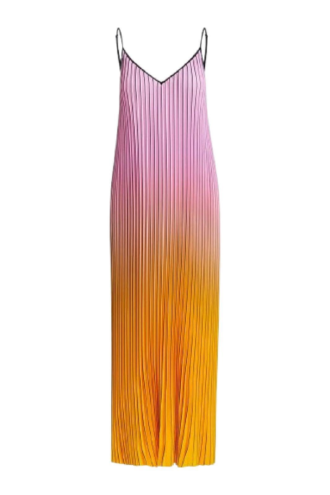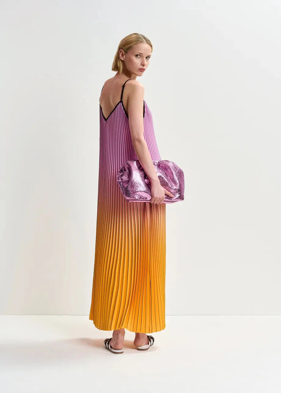 Langes Kleid von Essentiel Antwerp mit Falten und Farbverlauf von Pink zu Orange und Gelb. Die schwarzen Träger und der V-Ausschnitt bieten einen schönen Kontrast zu den Farben.