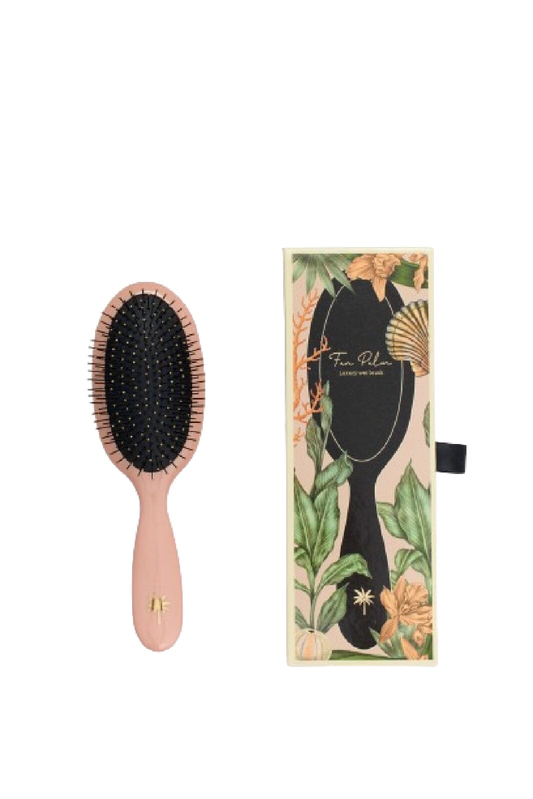 Rosa Haarbürste von Fan Palm mit Nylonborsten und goldbeschichteten Spitzen. Die Bürste kommt in einer dekorierten Box mit Blumenmotiven und hat einen Glitzereffekt im pinken Design.