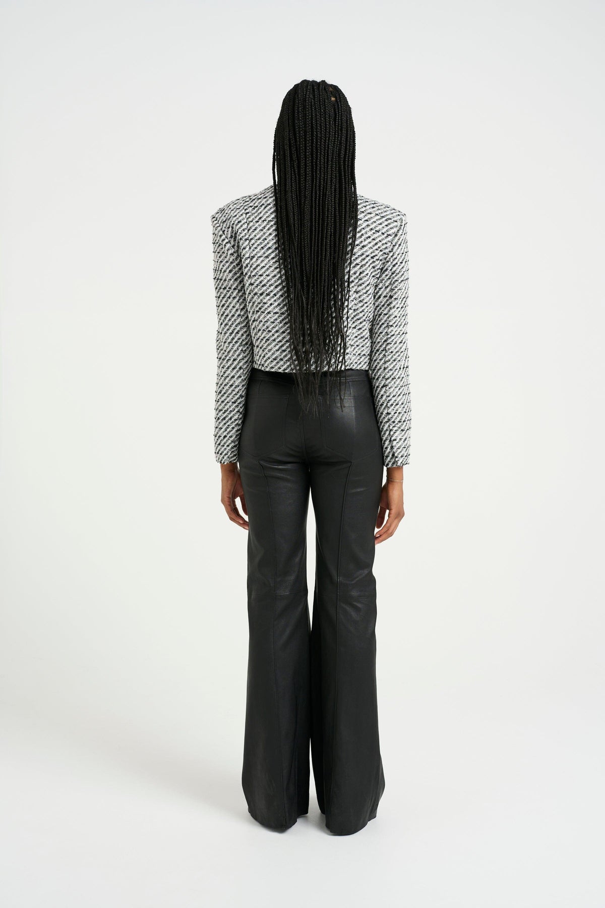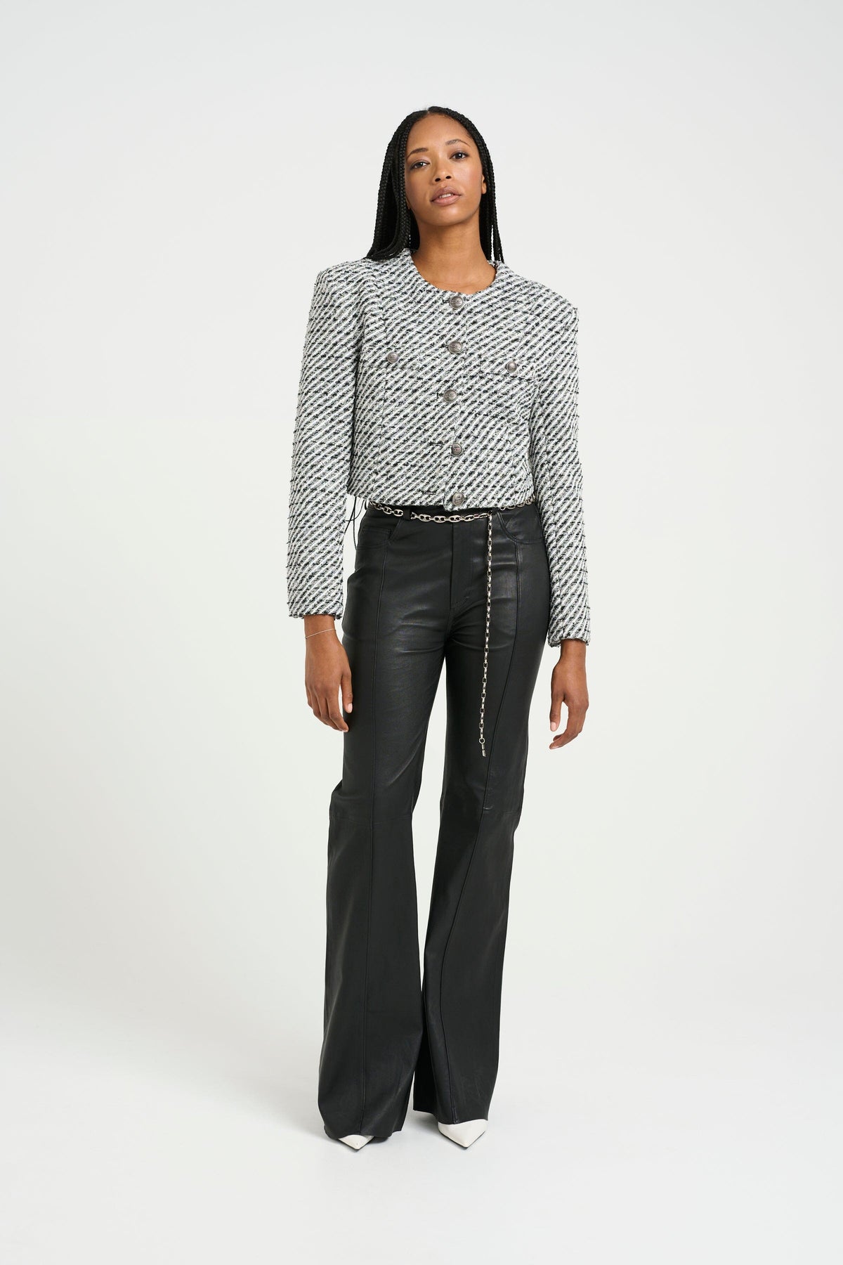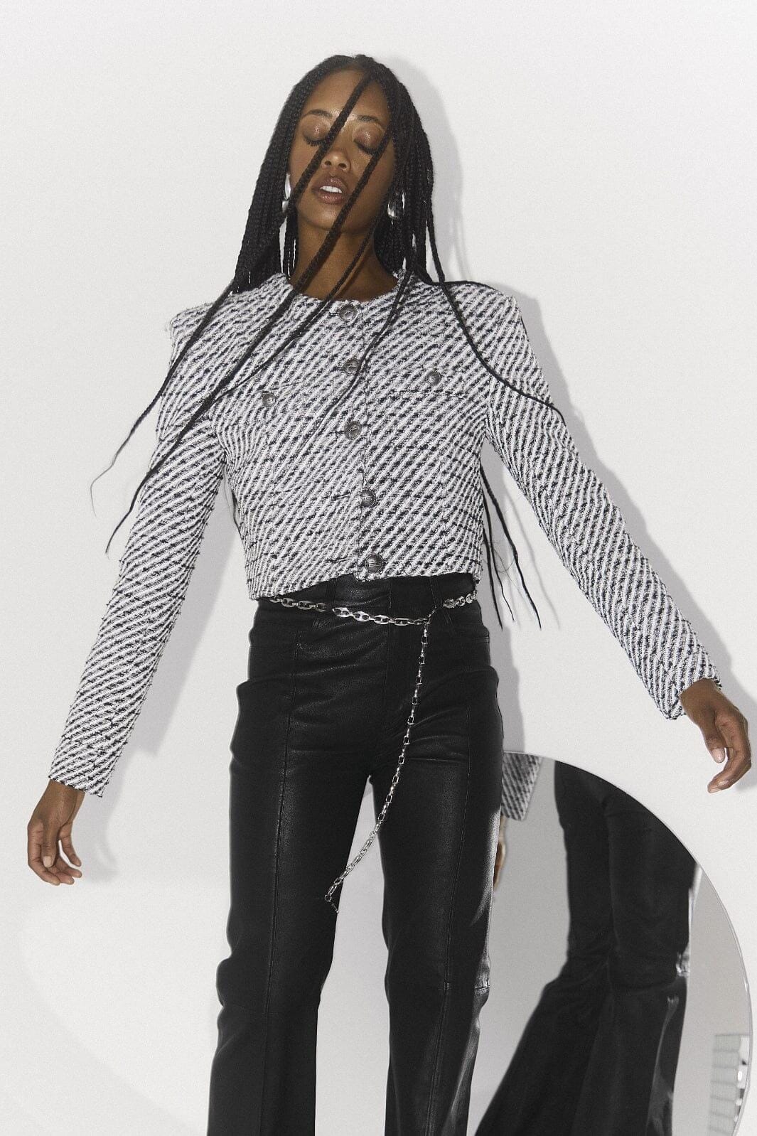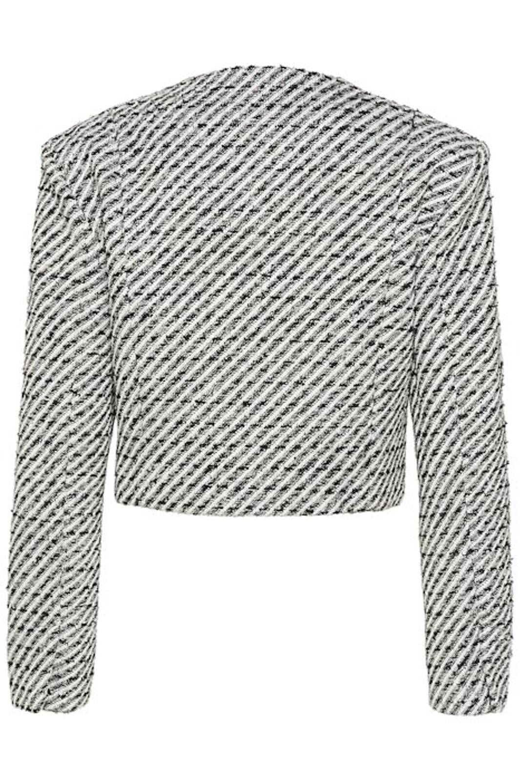 Schwarz-weiße Cropped-Jacke von Gestuz mit strukturierten Schultern und Lurex-Twill-Streifen. Die Jacke hat eine kurze Länge und Knöpfe vorne.