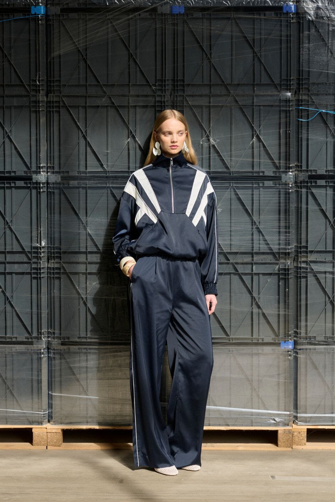 Anorak von Gestuz in Dunkelblau mit weißen grafischen Streifen. Er hat einen hohen Kragen, einen halben Reißverschluss und elastische Bündchen.