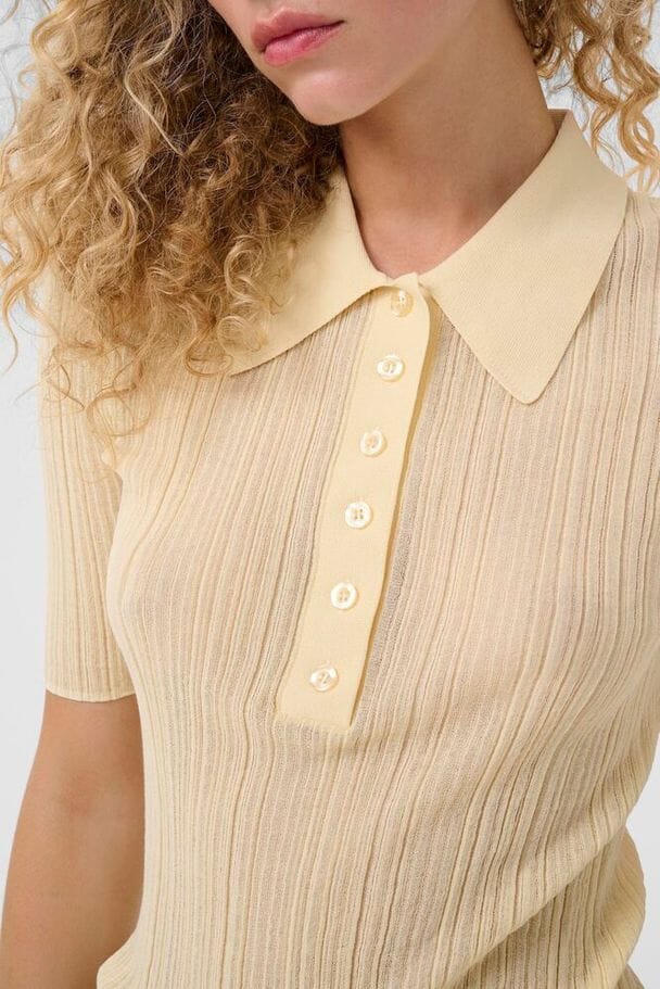 Gerippter Polotop von Gestuz in einem hellen Cremefarbton. Das Top besteht aus 82% Baumwolle und 18% Polyamid und hat einen klassischen Kragen mit Knopfleiste.