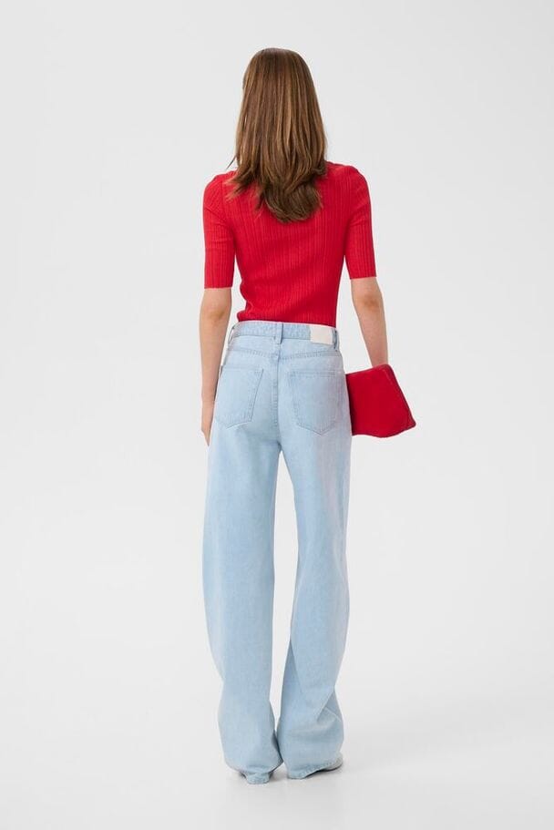 Rotes Poloshirt von Gestuz mit Rippstruktur. Das Top hat einen Polokragen mit Knöpfen vorne und kurze Ärmel.