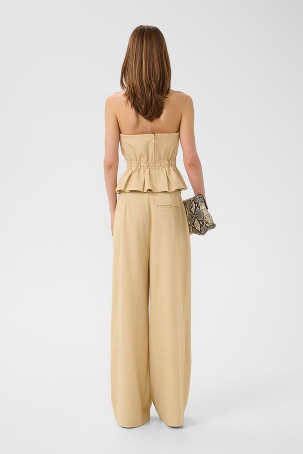 Schulterloses Top von Gestuz in einem hellbeigen Melange-Ton. Das Top hat einen Peplum-Effekt am Saum und vertikale Nähte.