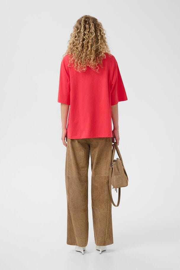T-Shirt von Gestuz in einem roten Tomatenton. Sie hat eine oversized Passform und besteht aus Bio-Baumwolle mit einer dezenten Stickerei auf der Brust.