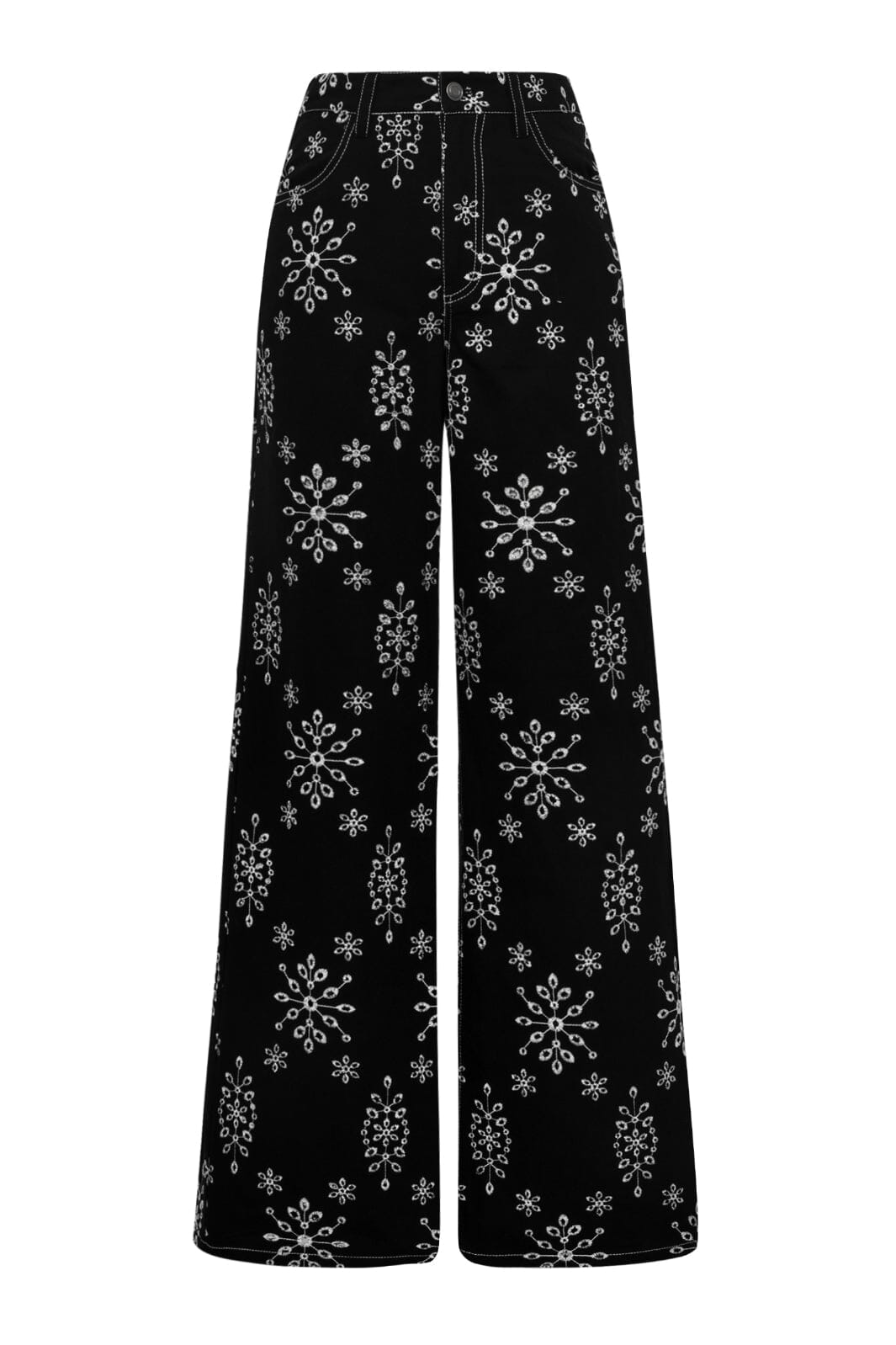 Schwarze Jeans von Global Funk mit weißem Schneeflockenmuster. Die Hose hat einen weiten Beinstil und eine bodenlange Länge. Sie sind mit Stickerei und dekorativen Nähten gefertigt, die einen besonderen Ausdruck verleihen.