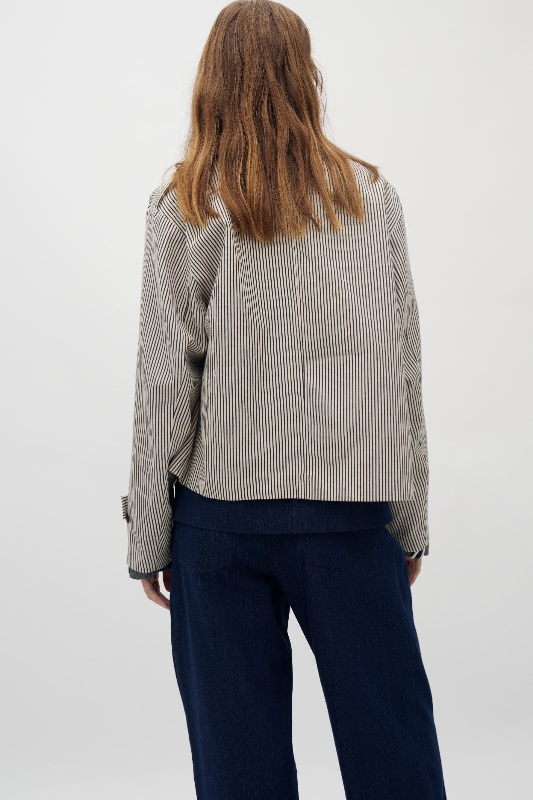 Kurze Jacke von Global Funk in Schwarz und Beigen Streifen. Die doppelte Knopfleiste hat große Knöpfe, und die Jacke kommt mit einem Hemdkragen und langen Ärmeln.