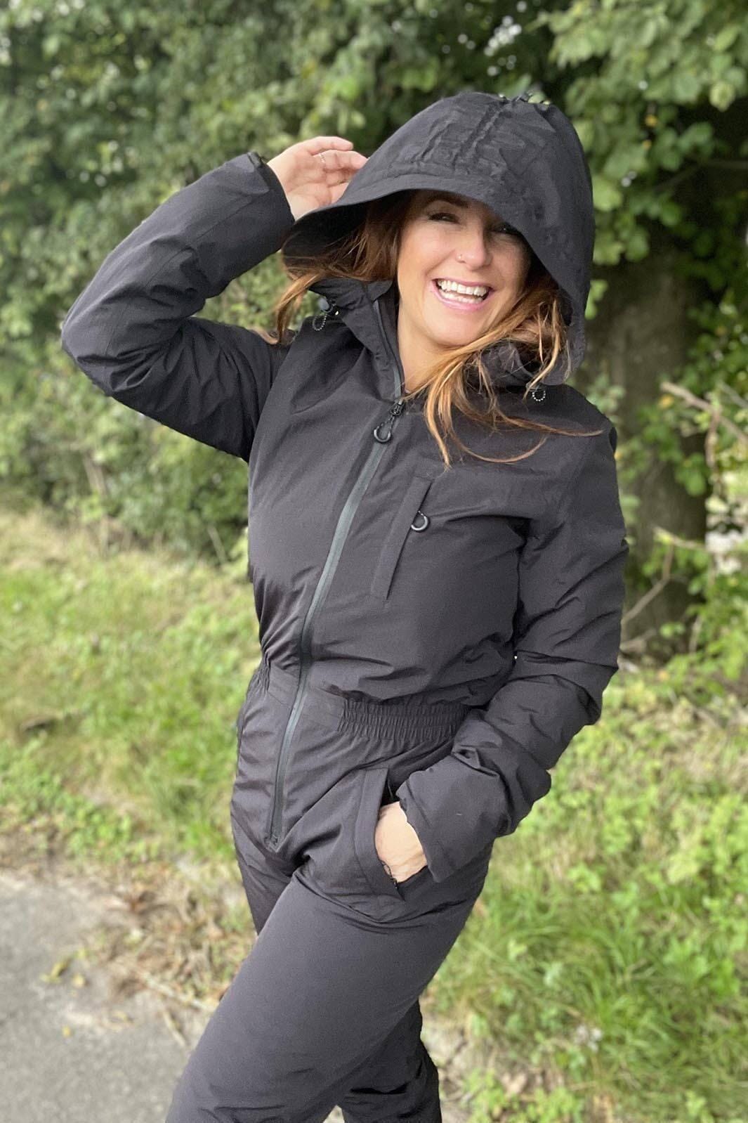 Schwarzer Overall aus atmungsaktivem Material mit wasserabweisenden Eigenschaften. Der Overall hat ein Fleecefutter im Oberkörper und in der Kapuze sowie Polyesterfüllung in den Ärmeln und Beinen.