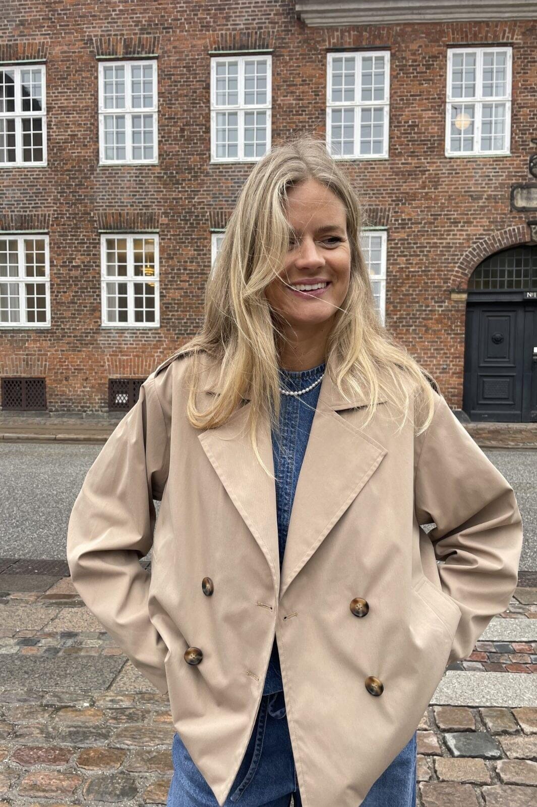 Beige Jacke von Global Funk mit doppelter Knopfleiste. Sie hat große Knöpfe und einen klassischen Kragen, der der Jacke einen klaren und einfachen Ausdruck verleiht.