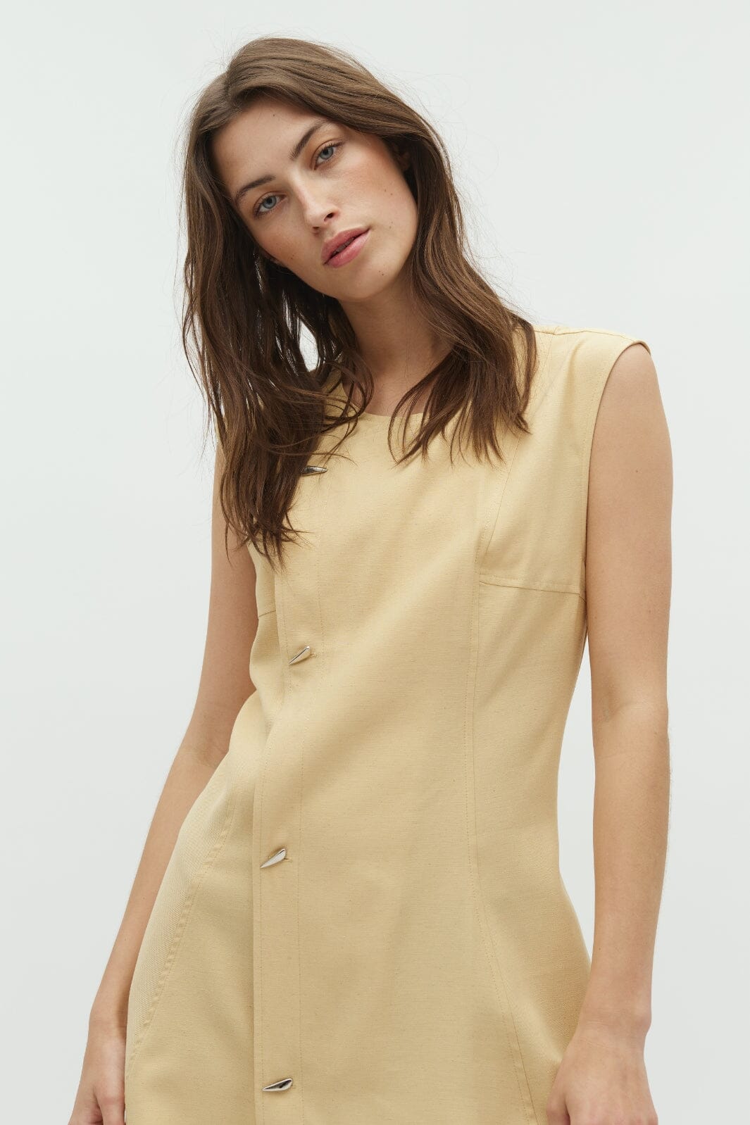 Kurzes Kleid von Global Funk in einem hellgelben Melange-Farbton. Das Kleid hat einen V-Ausschnitt und Knöpfe vorne. Es ist knielang geschnitten mit einer A-Linie und kurzen Ärmeln.