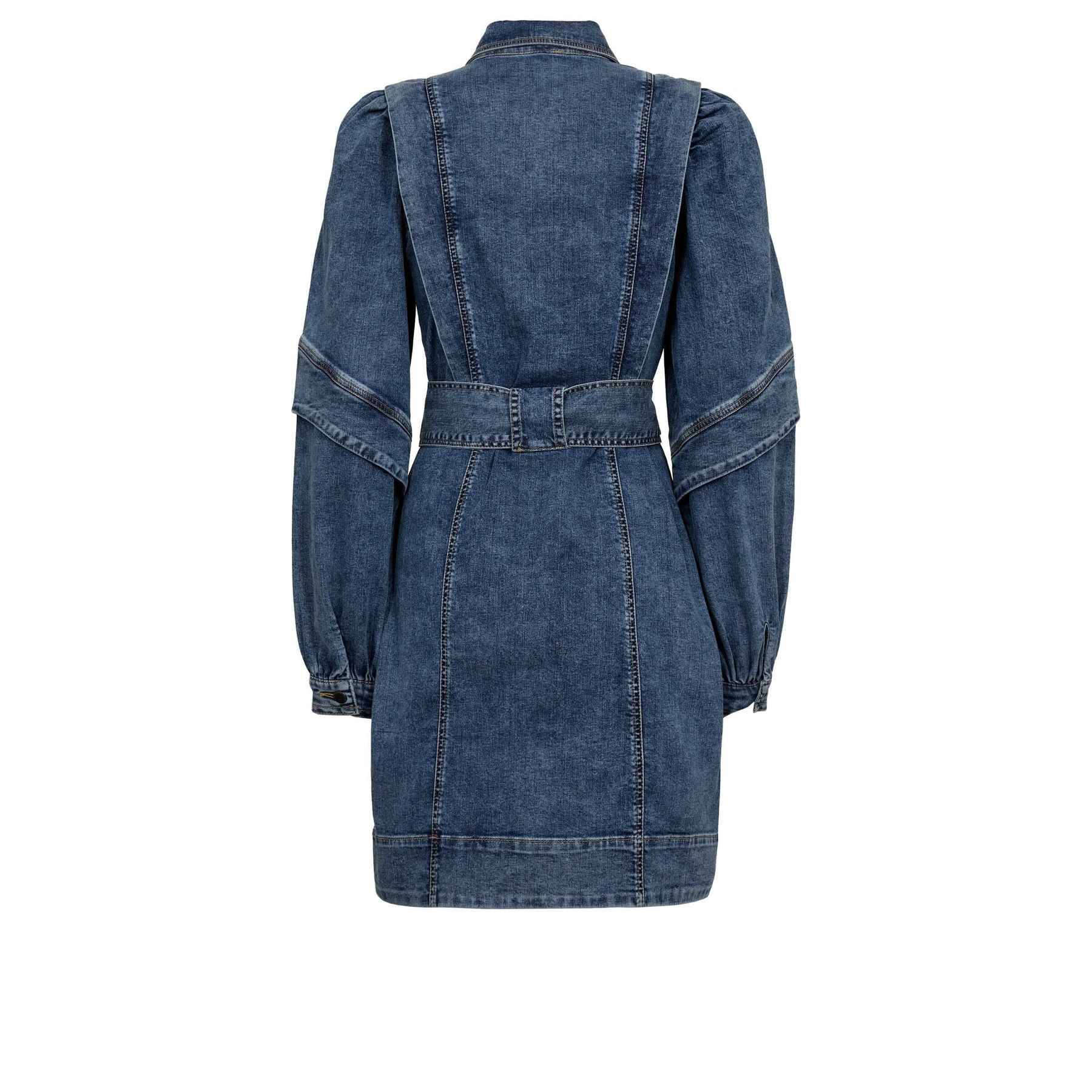 Jeanskleid von Gossia in mittelblauem Denim. Das Kleid hat einen Hemdkragen, lange Ärmel und reicht bis zum Oberschenkel. Es hat dekorative Nähte und einen Bindegürtel.
