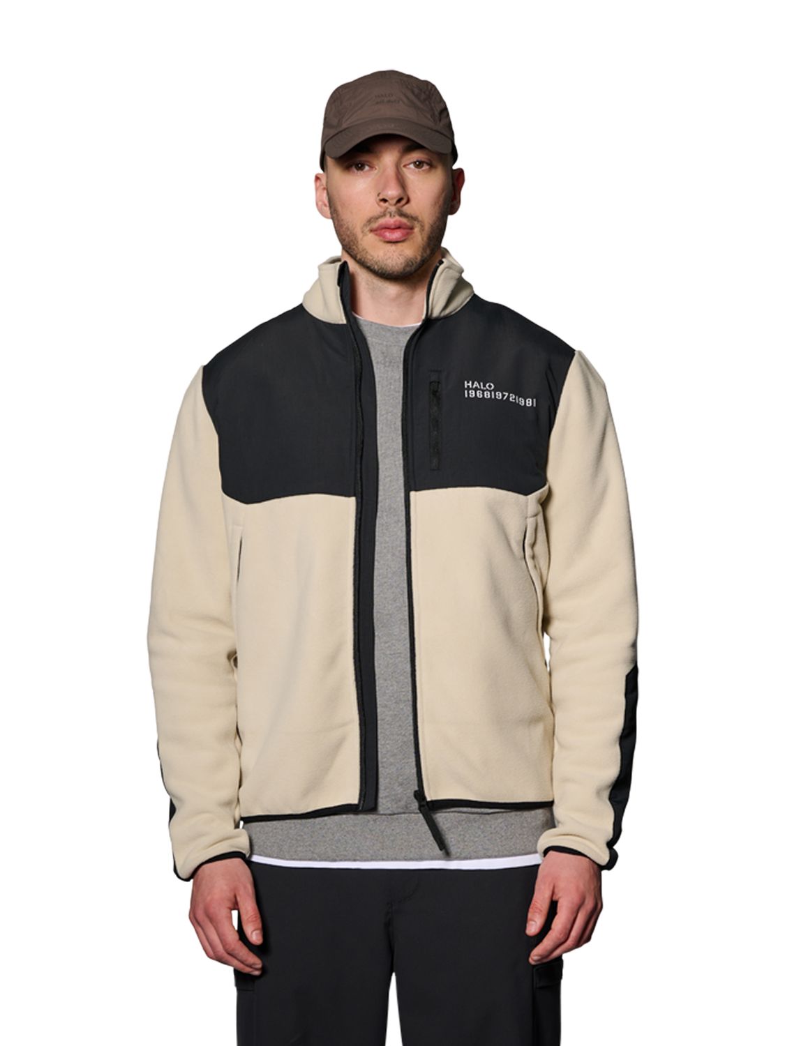 Fleecejacke von Halo in einem hellen graubeigen Farbton. Die Jacke kombiniert technische Fleecequalität mit strapazierfähigen Cordura-Einsätzen an Schultern und Ellbogen.