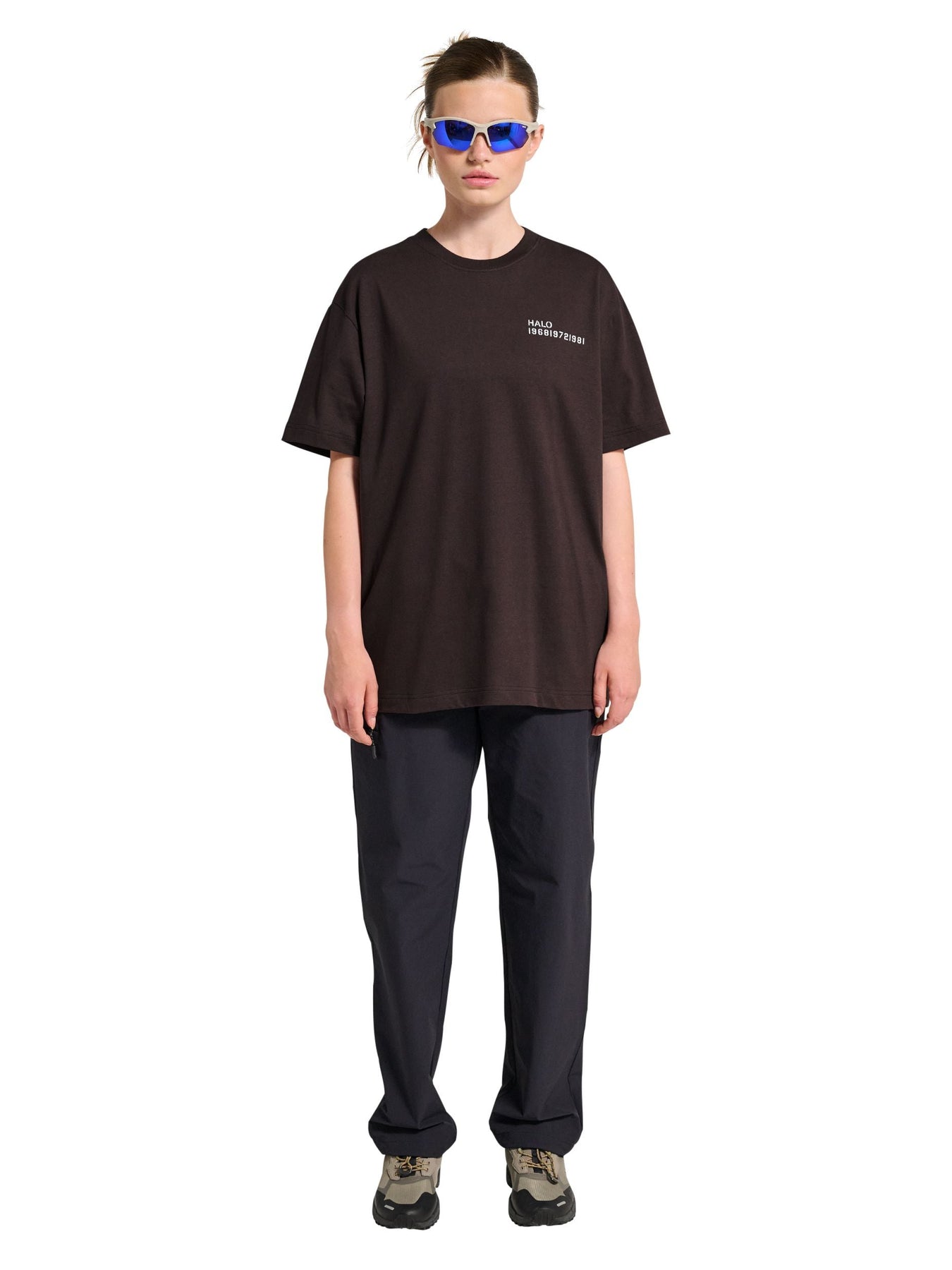 Dunkelbraunes T-Shirt von HALO aus 100 % Bio-Baumwolle. Das T-Shirt hat kurze Ärmel und eine lockere Passform mit F.U.T.-Schriftzug auf der Rückseite.